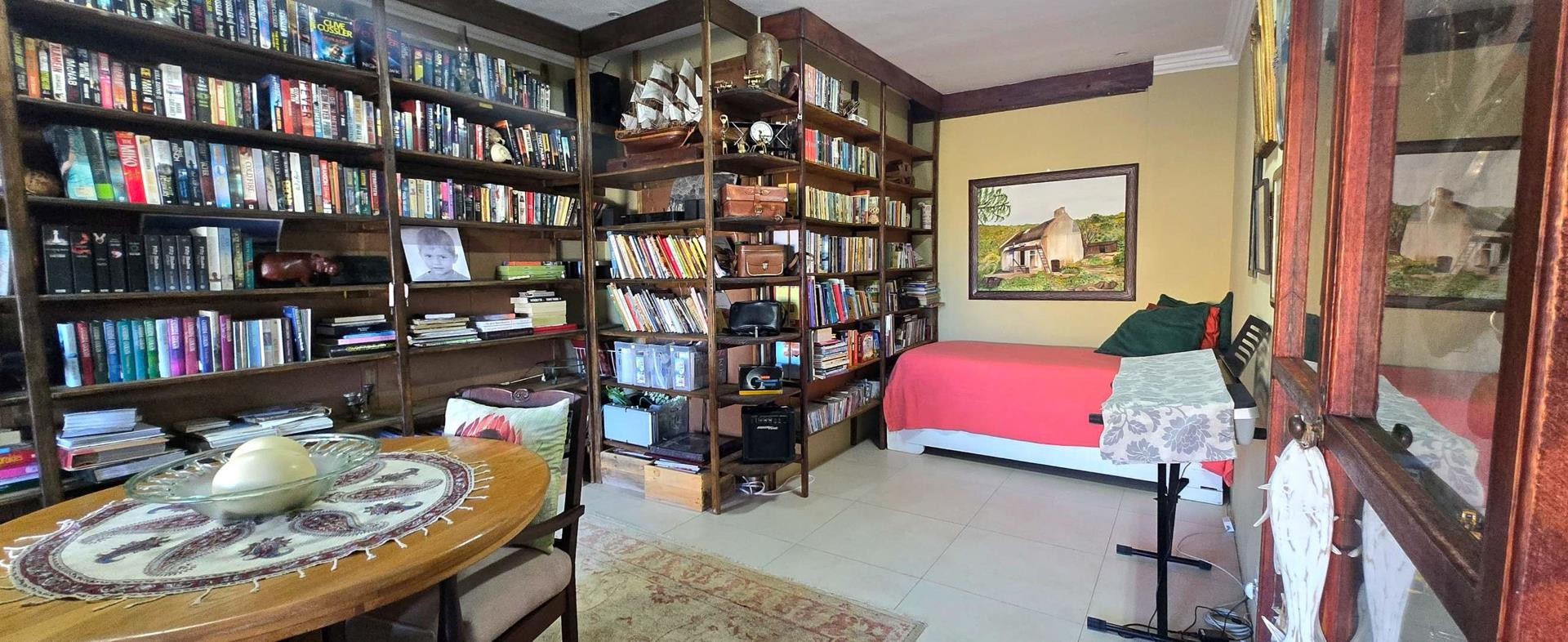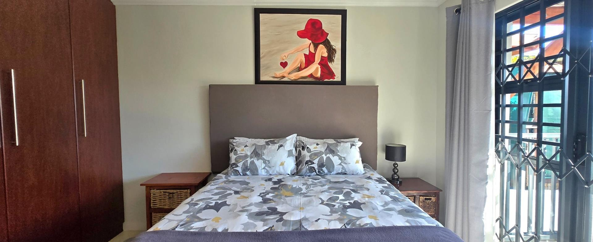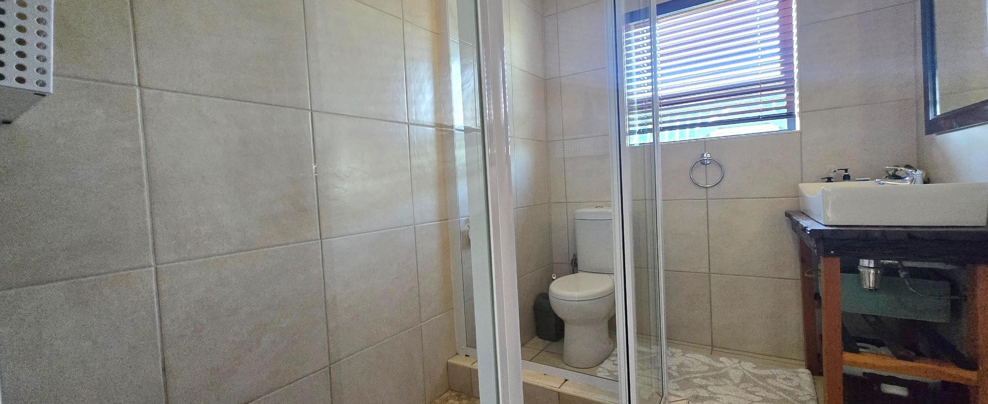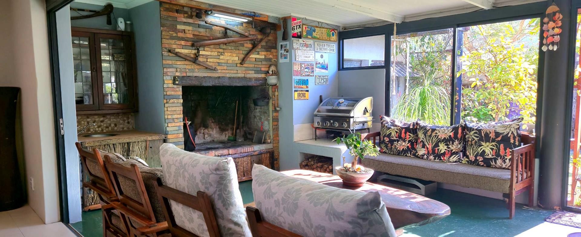 The heart of the home is a beautifully finished kitchen, with smooth granite countertops and a separate walk-in pantry. It connects effortlessly to a dining area that opens out to a covered patio—perfect for weekend braais or evening meals with friends. Upstairs, a formal lounge with a built-in fireplace and private balcony provides a peaceful retreat with distant views of the sea.