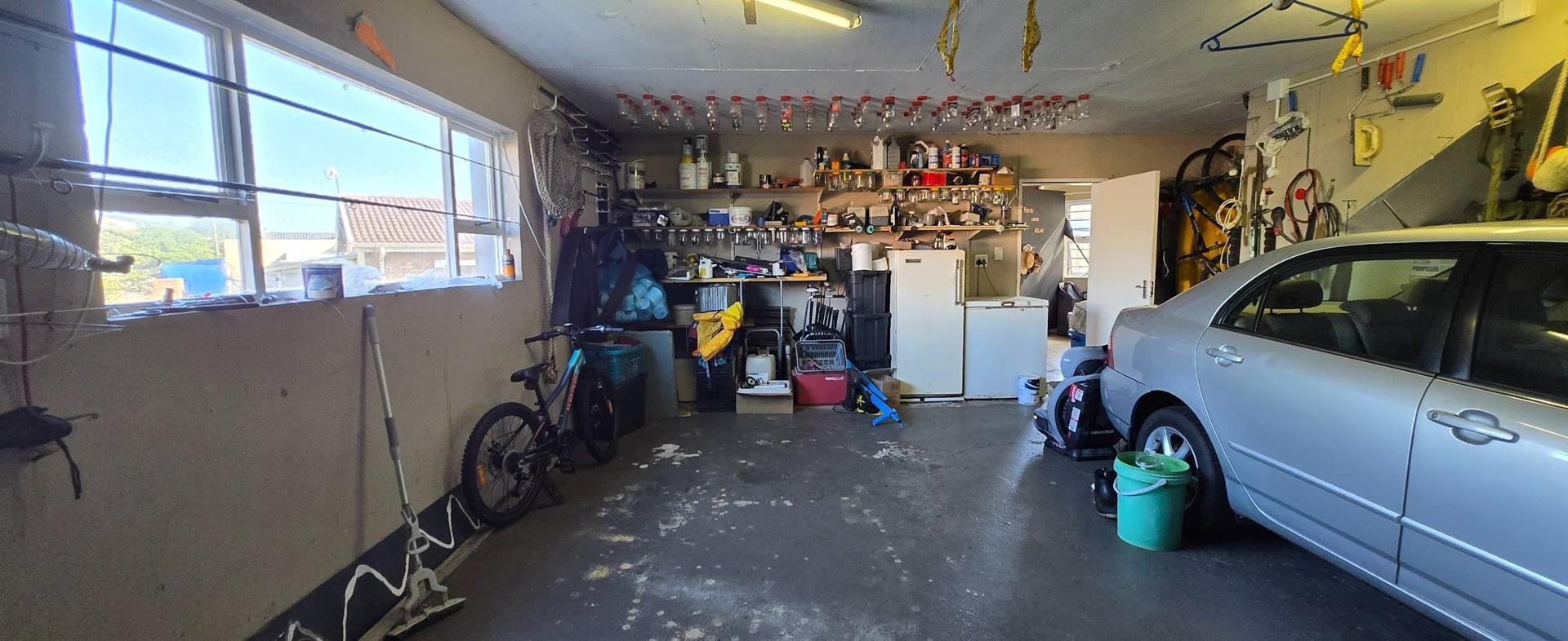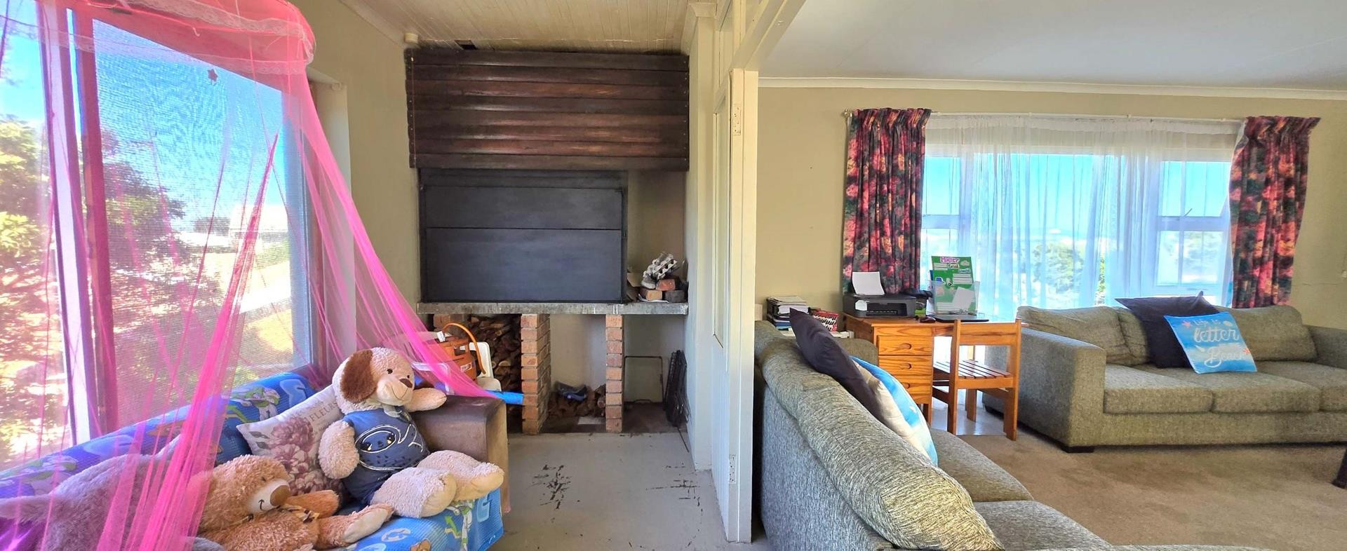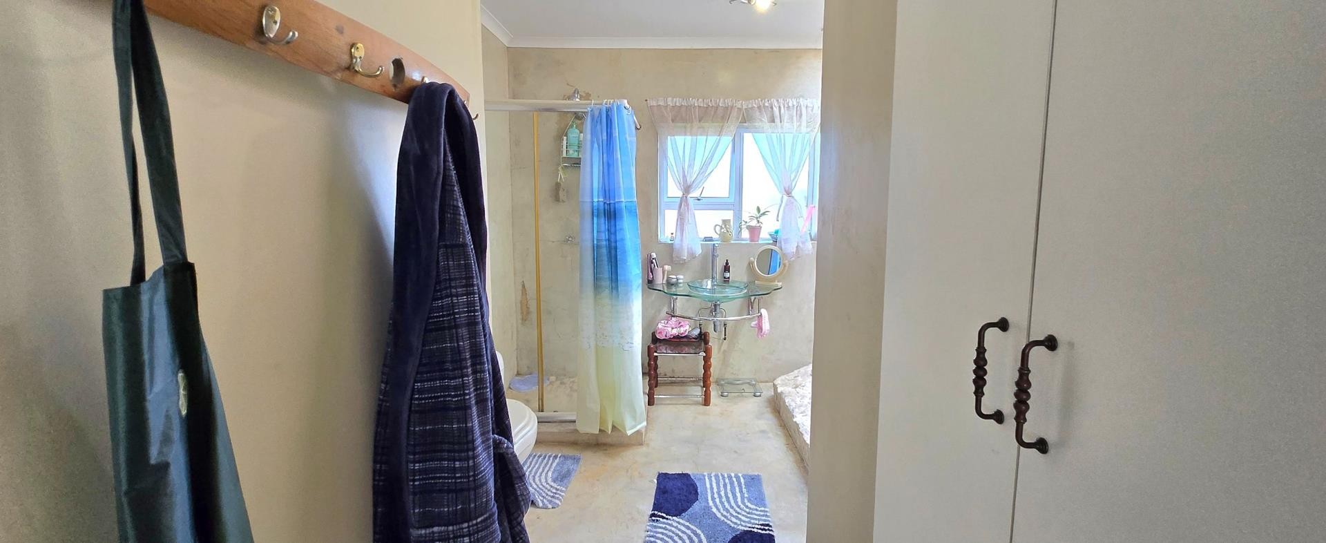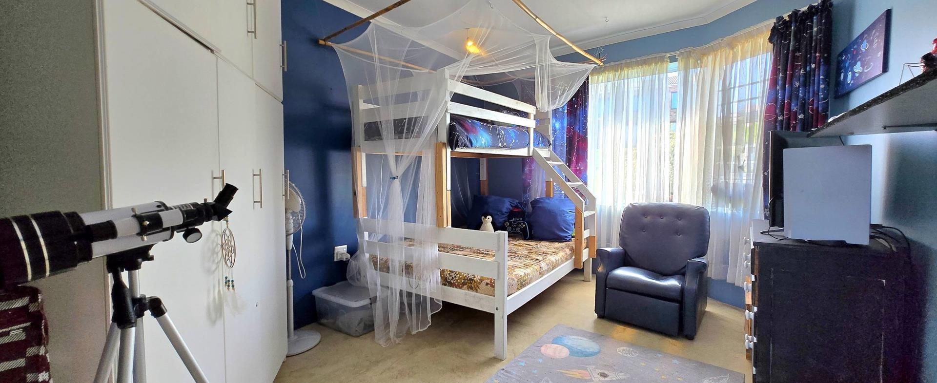 The open-plan kitchen is ideal for modern living, featuring an adjacent scullery for added convenience. The upstairs living and braai room offer distant sea views, perfect for entertaining all year round thanks to the built-in indoor braai. The home also features low-maintenance cement screed flooring throughout.