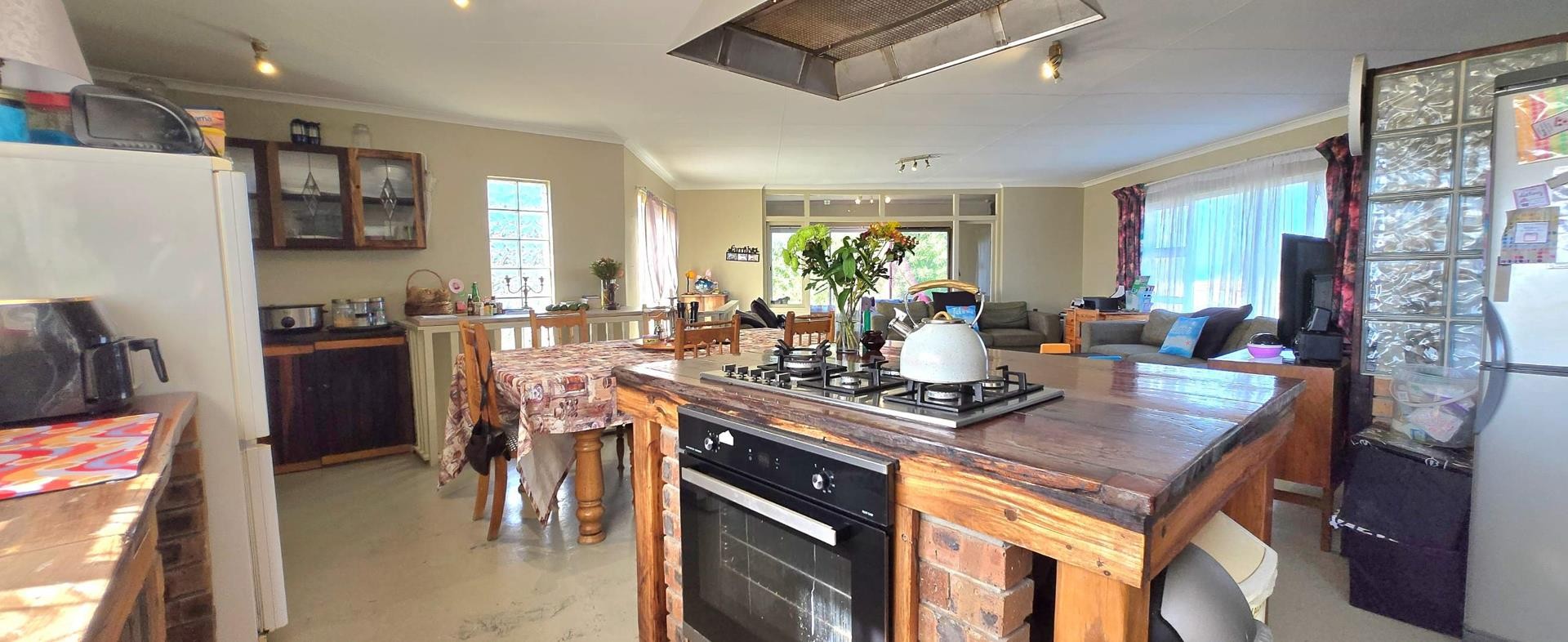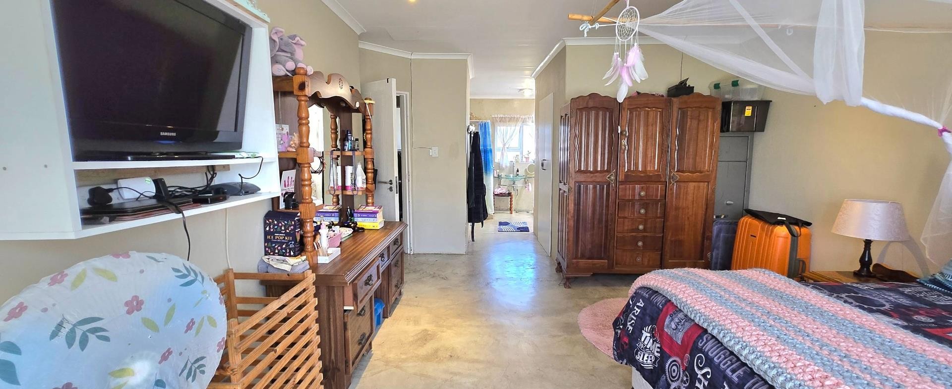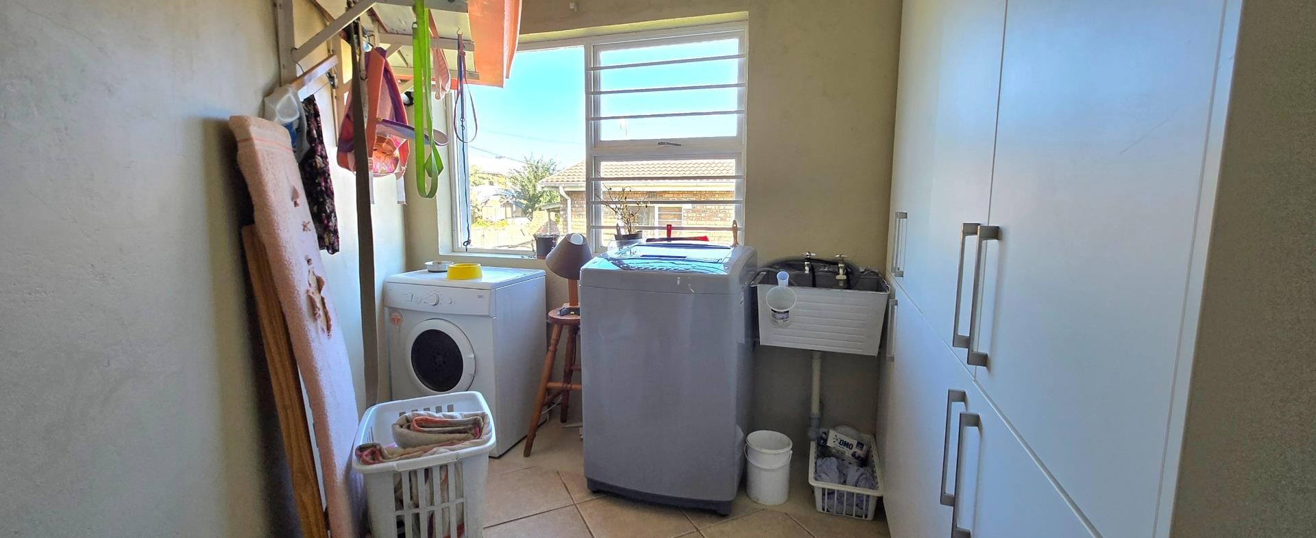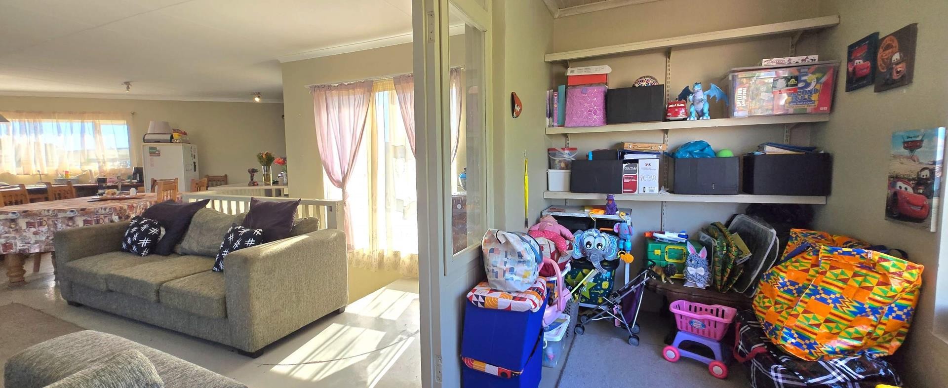 The open-plan kitchen is ideal for modern living, featuring an adjacent scullery for added convenience. The upstairs living and braai room offer distant sea views, perfect for entertaining all year round thanks to the built-in indoor braai. The home also features low-maintenance cement screed flooring throughout.
