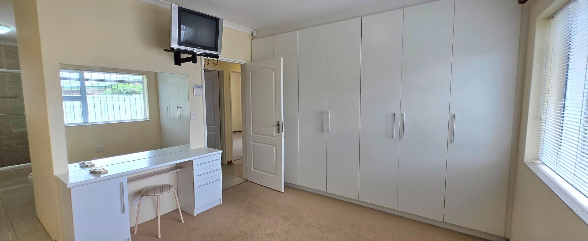The main bedroom features an en-suite bathroom and air conditioning, while the two additional bedrooms share a full bathroom. Throughout the home you'll find built-in cupboards, blinds, burglar bars, and thoughtful touches like a linen cupboard in the hallway. The double garage includes one automated and one manual door, with plenty of extra storage space.
