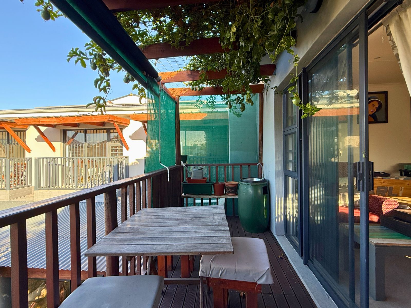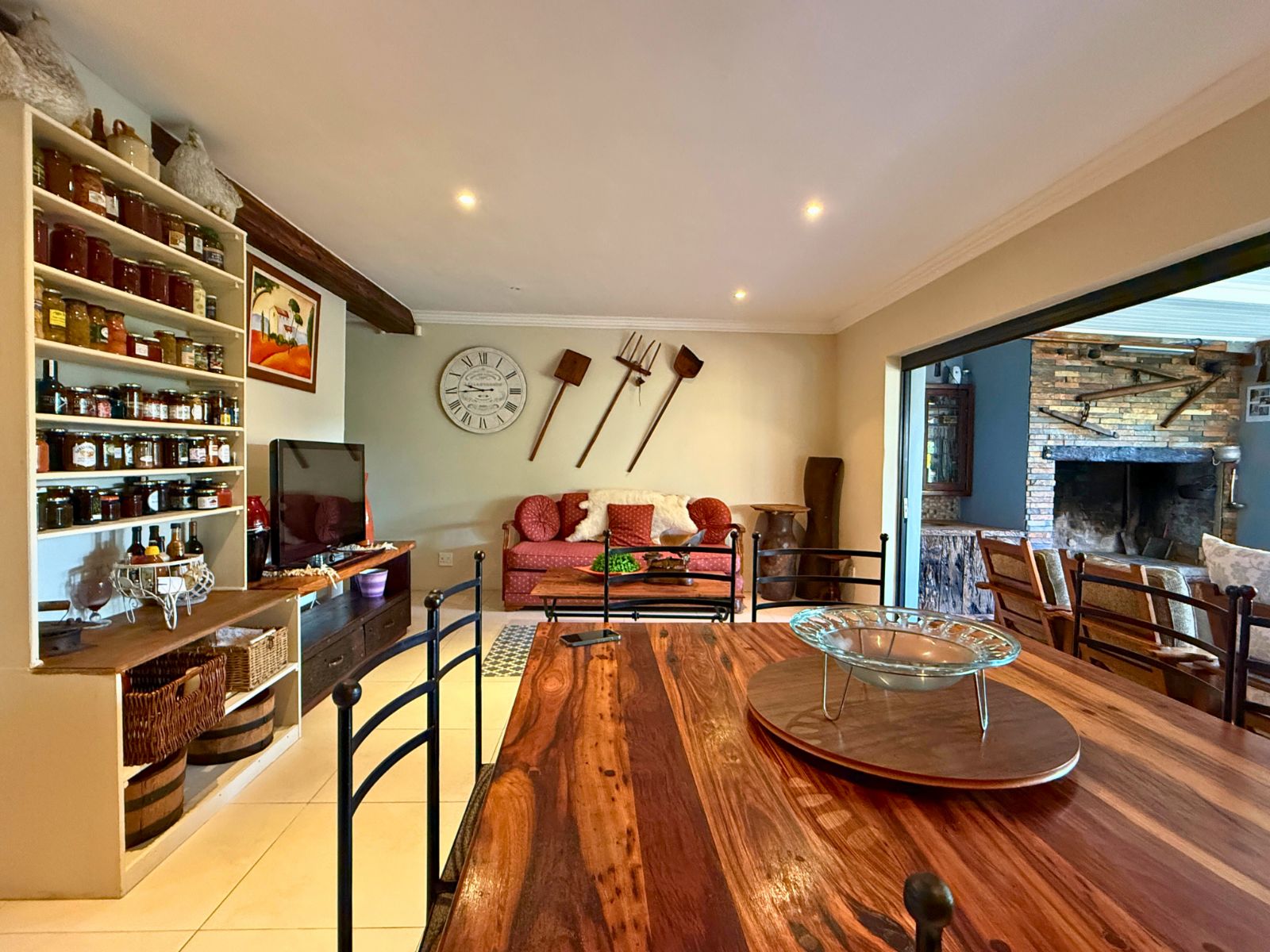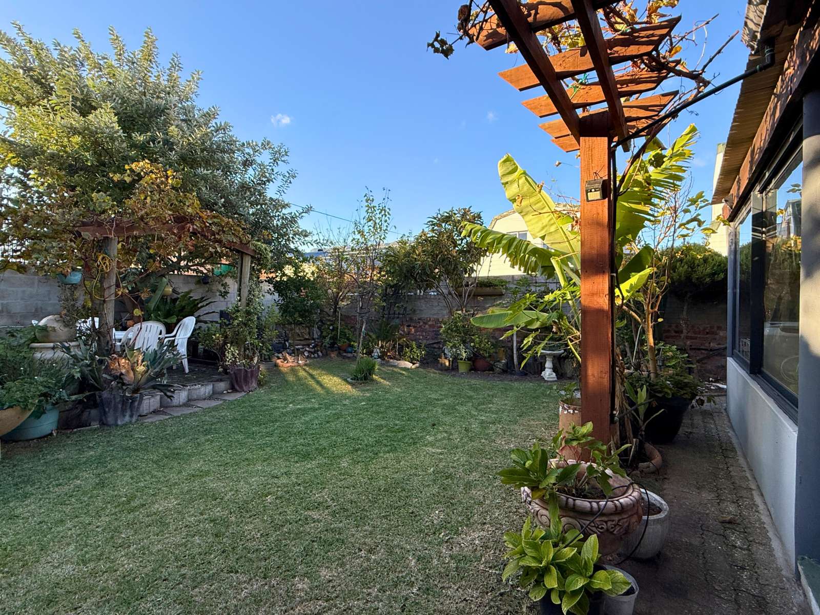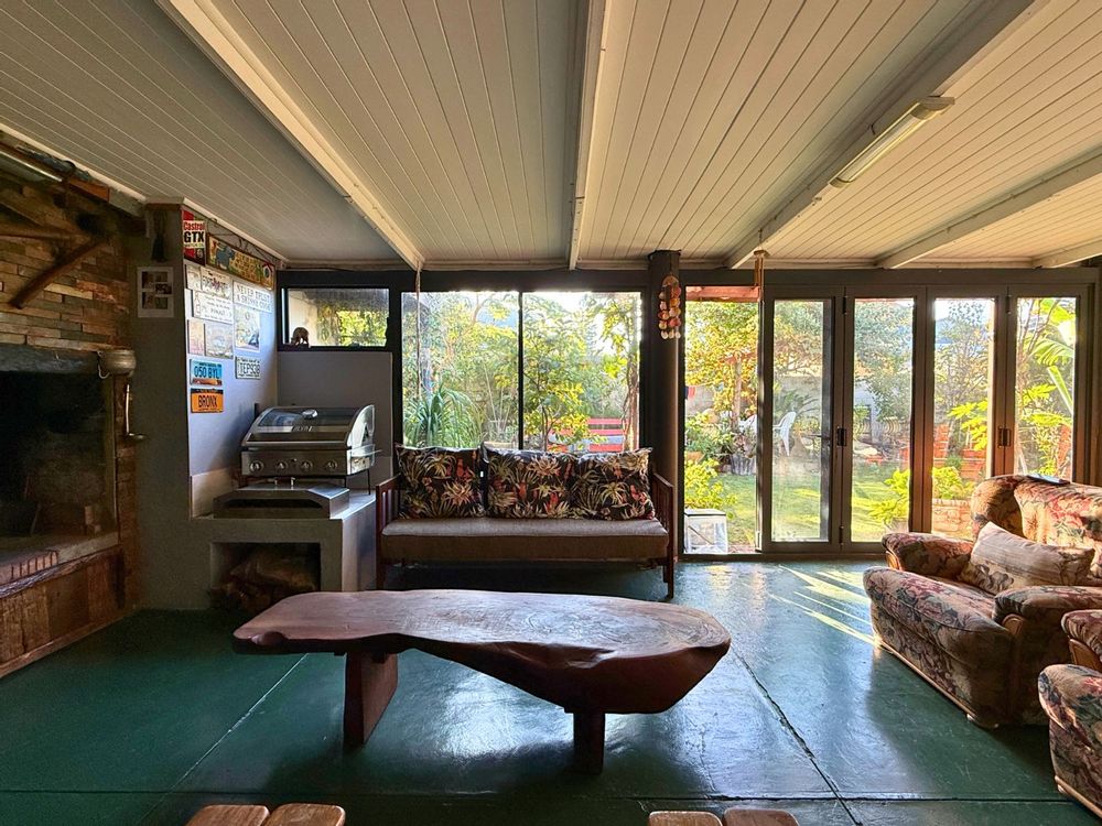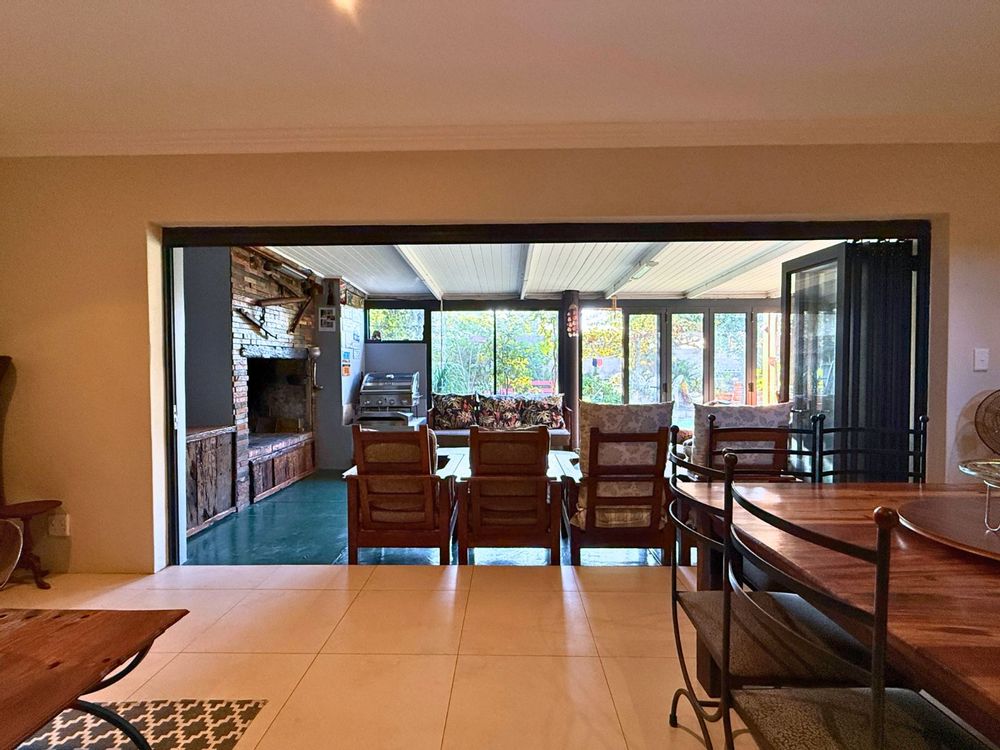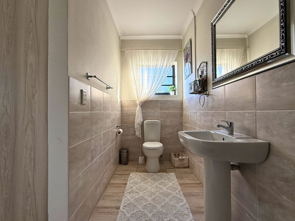 At the heart of the home lies a modern kitchen that is as functional as it is stylish, with stunning granite countertops, ample cabinetry, and a dedicated pantry for additional storage. Just off the dining area, you’ll discover a spectacular enclosed entertainment space, perfect for relaxed socializing. With folding stacker doors that seamlessly open to a beautiful garden complete with fruit-bearing grapevines, this space is designed for effortless indoor-outdoor living. It’s complemented by a built-in braai, prep bowl, and basin, making it an entertainer’s dream.