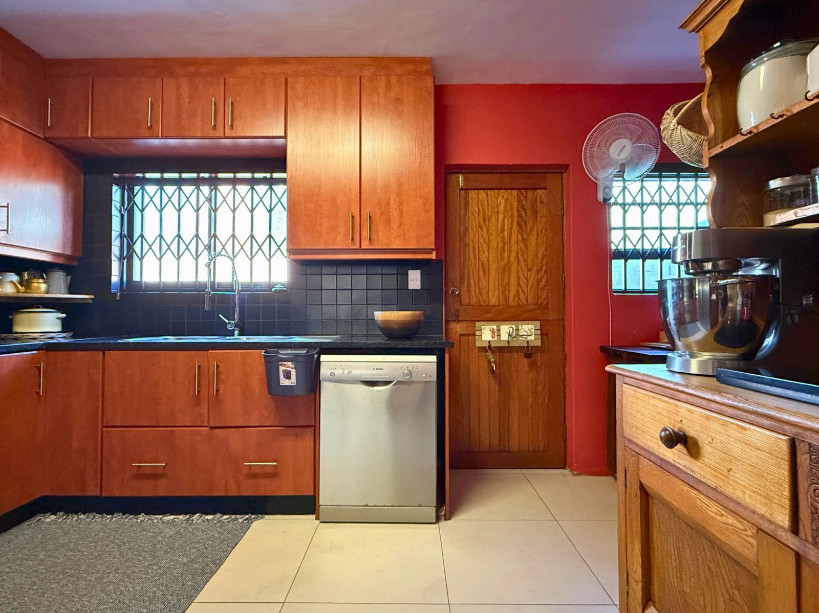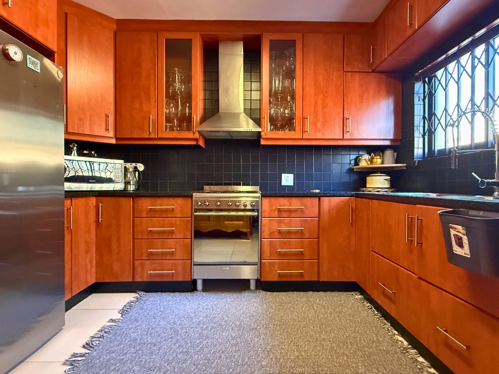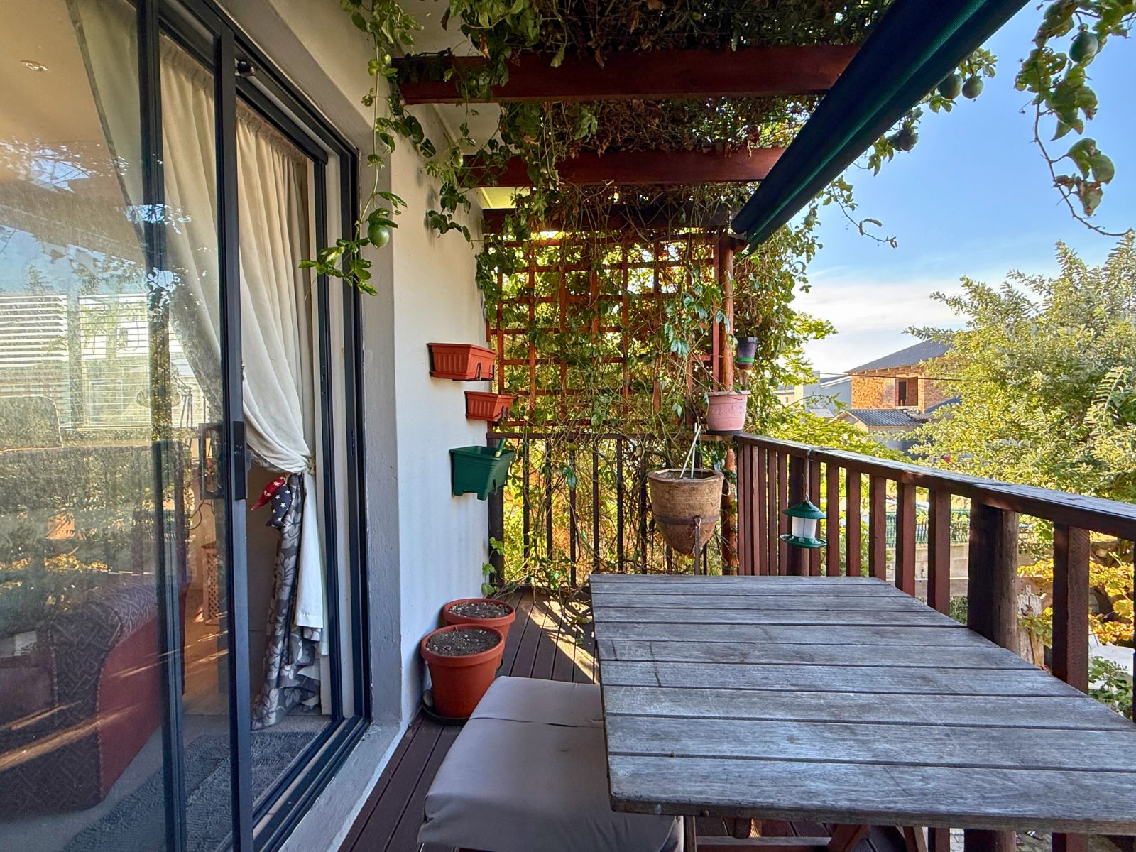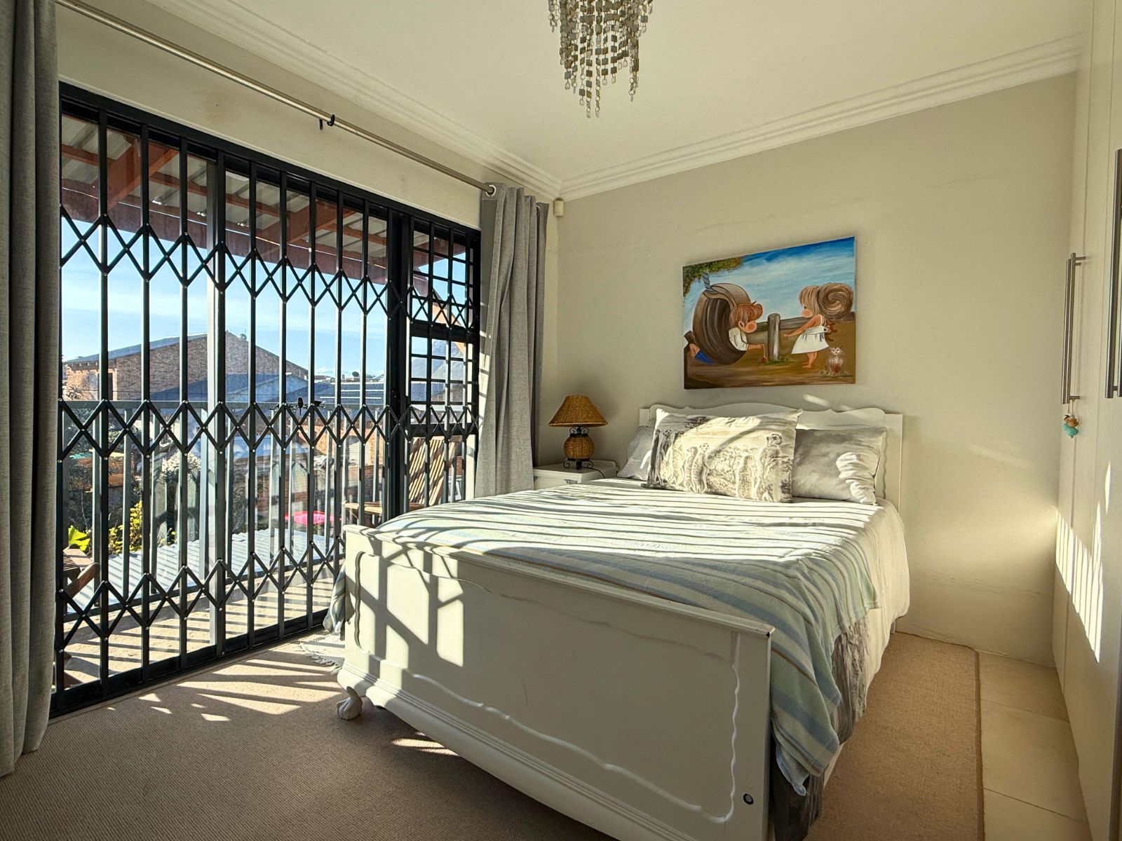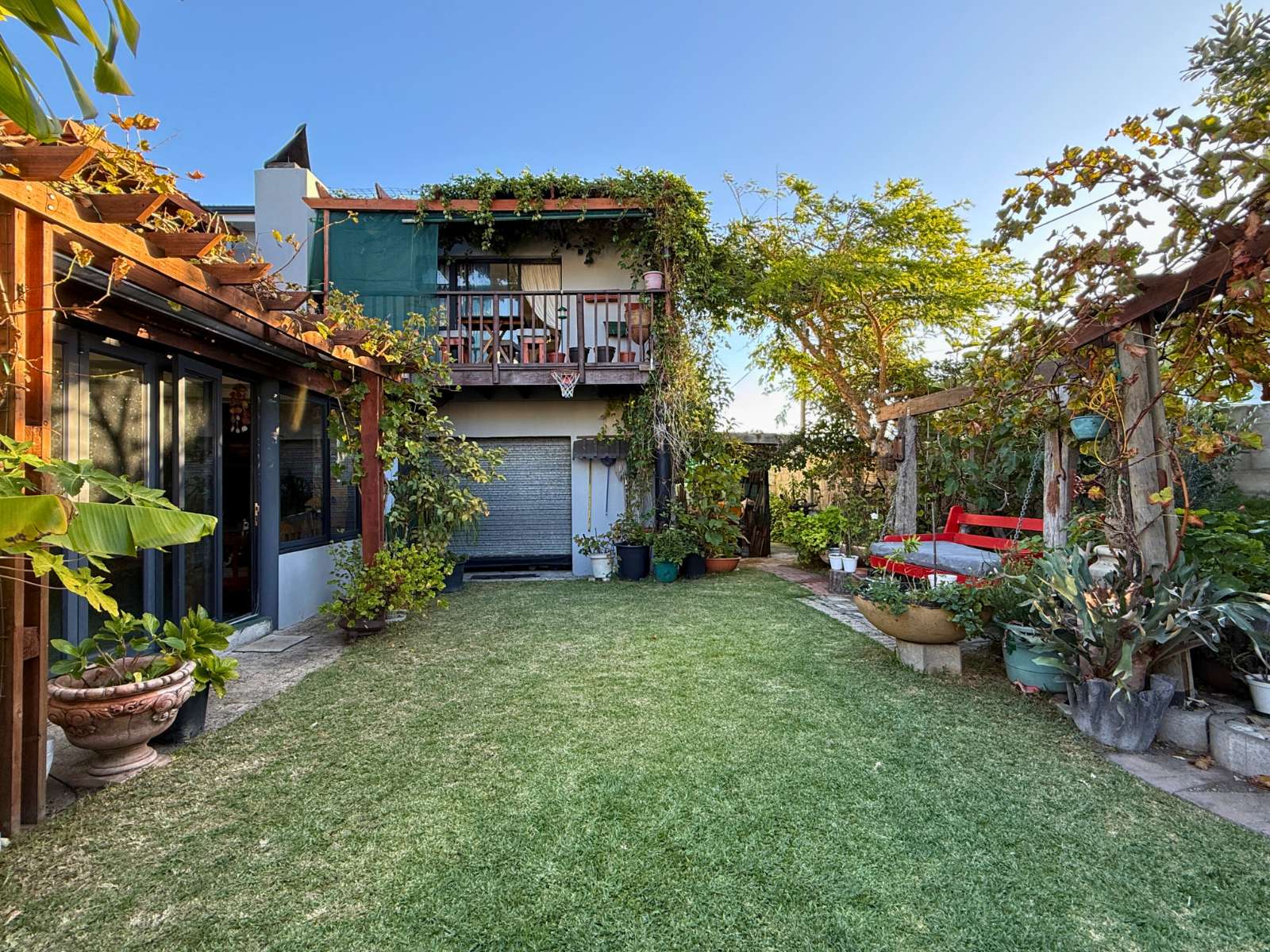At the heart of the home lies a modern kitchen that is as functional as it is stylish, with stunning granite countertops, ample cabinetry, and a dedicated pantry for additional storage. Just off the dining area, you’ll discover a spectacular enclosed entertainment space, perfect for relaxed socializing. With folding stacker doors that seamlessly open to a beautiful garden complete with fruit-bearing grapevines, this space is designed for effortless indoor-outdoor living. It’s complemented by a built-in braai, prep bowl, and basin, making it an entertainer’s dream.