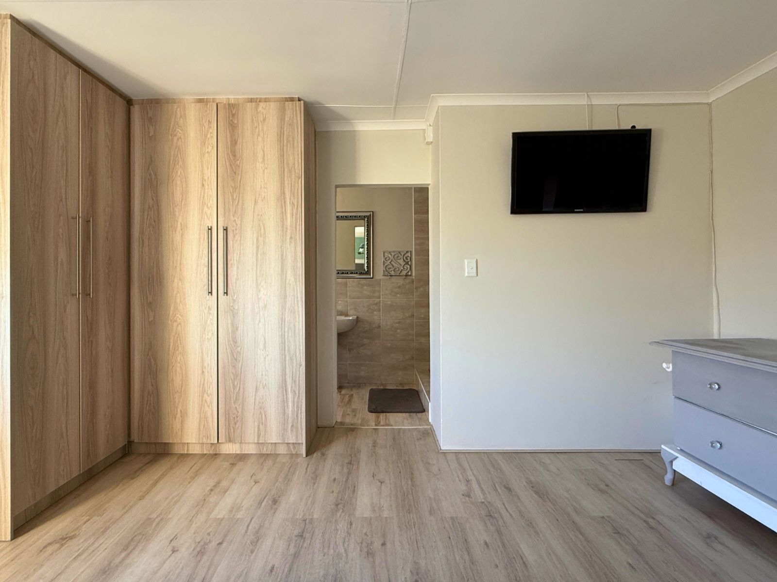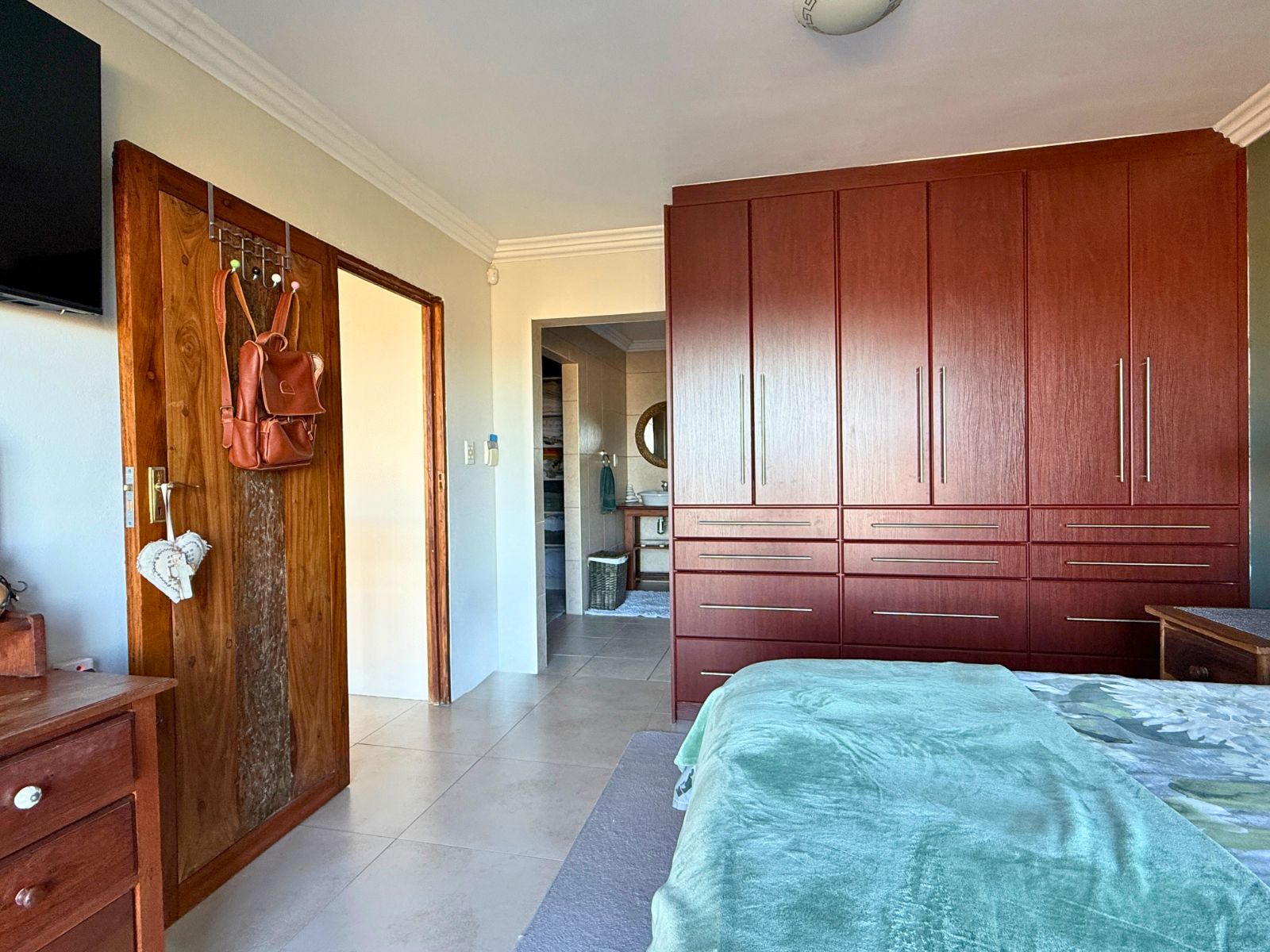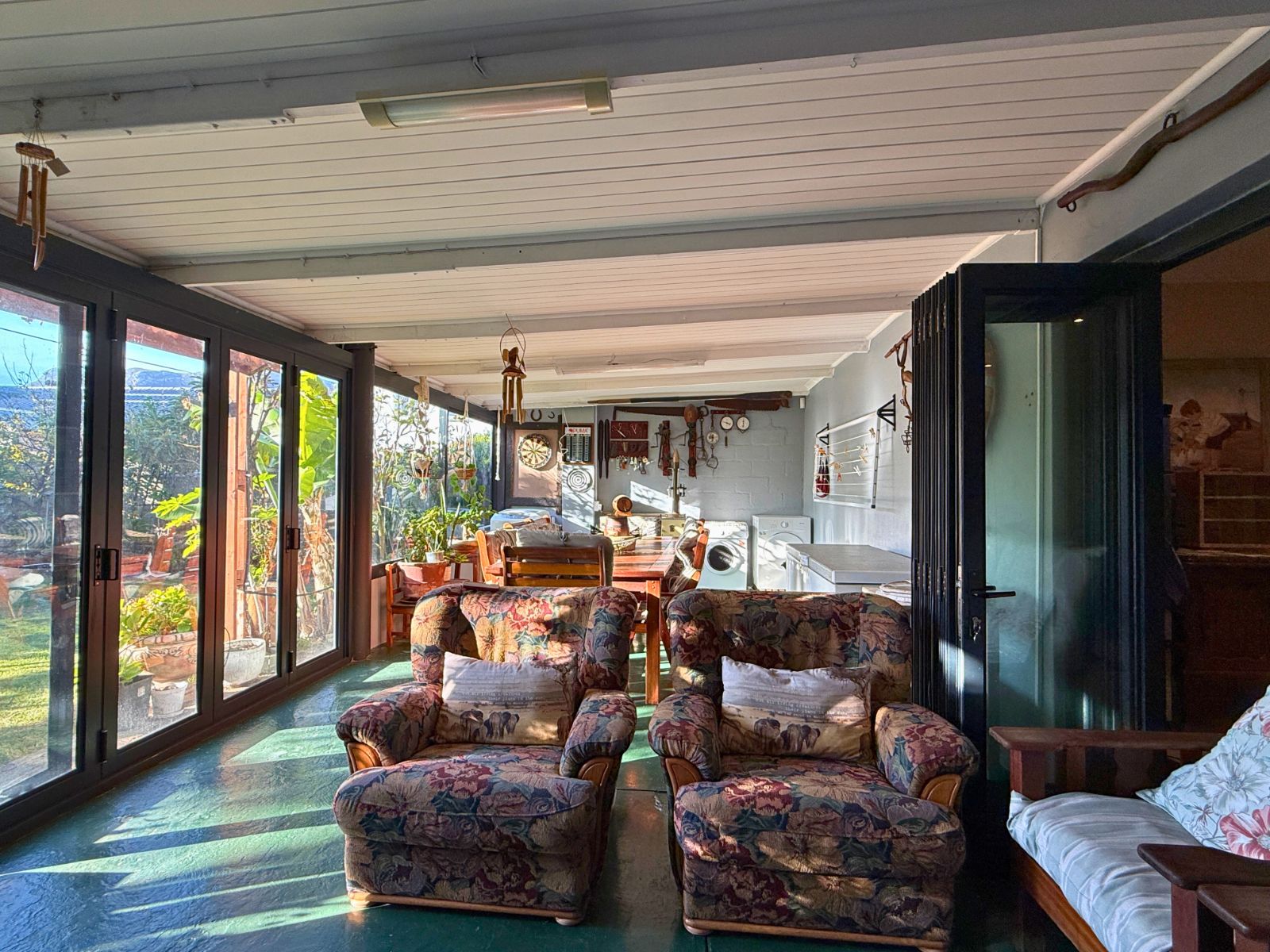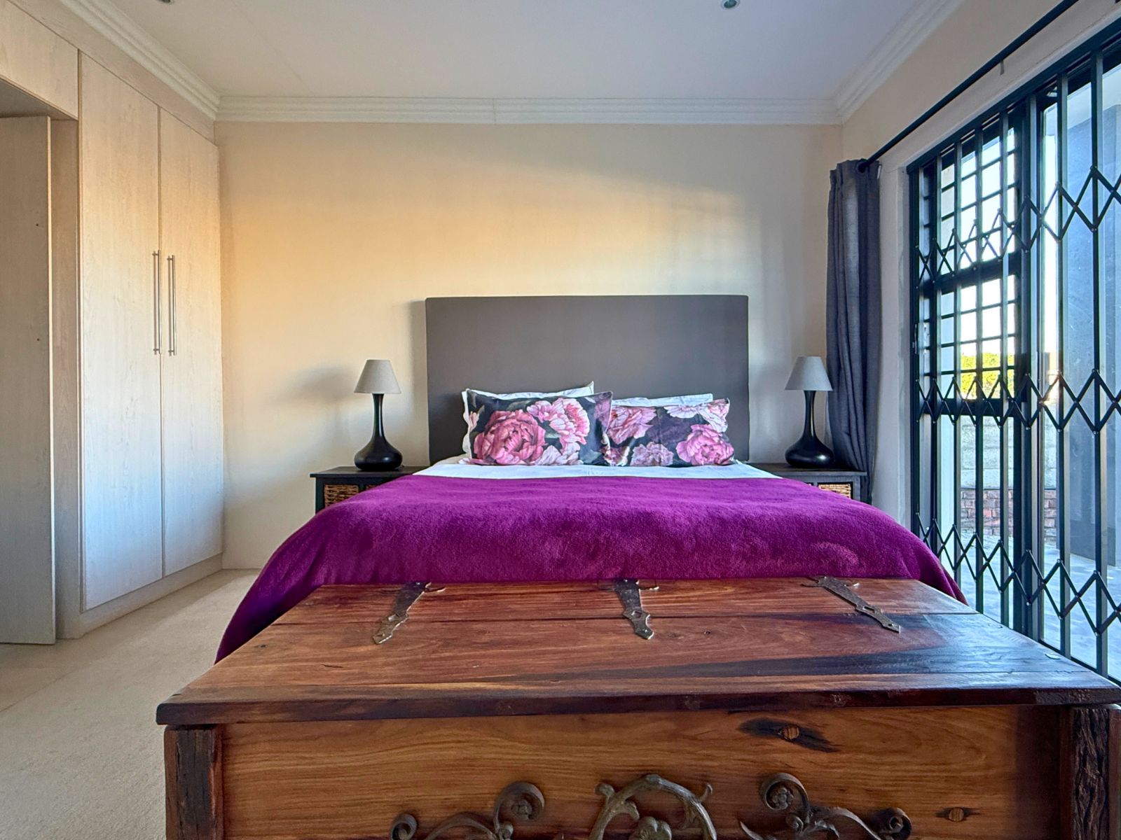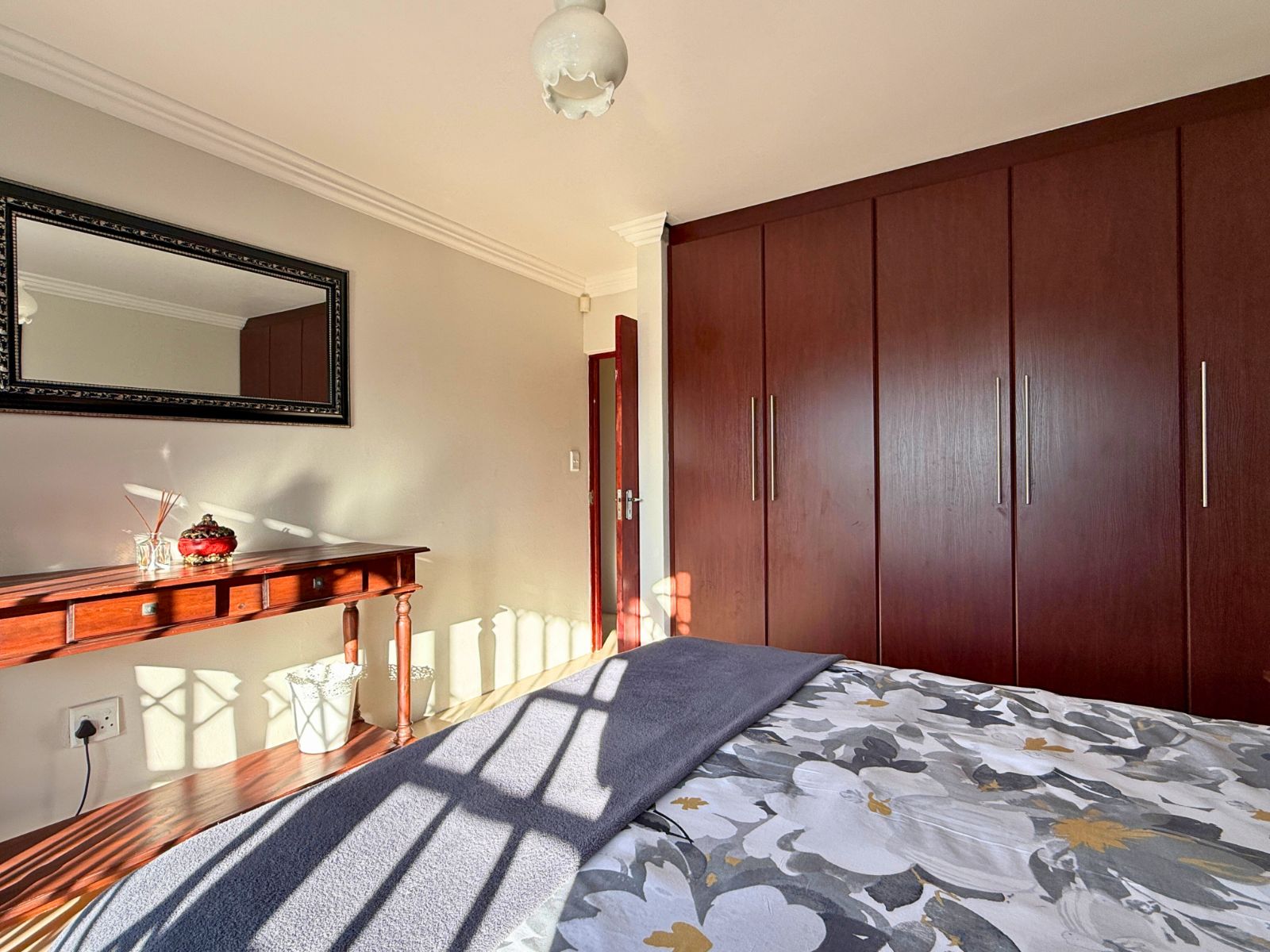At the heart of the home lies a modern kitchen that is as functional as it is stylish, with stunning granite countertops, ample cabinetry, and a dedicated pantry for additional storage. Just off the dining area, you’ll discover a spectacular enclosed entertainment space, perfect for relaxed socializing. With folding stacker doors that seamlessly open to a beautiful garden complete with fruit-bearing grapevines, this space is designed for effortless indoor-outdoor living. It’s complemented by a built-in braai, prep bowl, and basin, making it an entertainer’s dream.