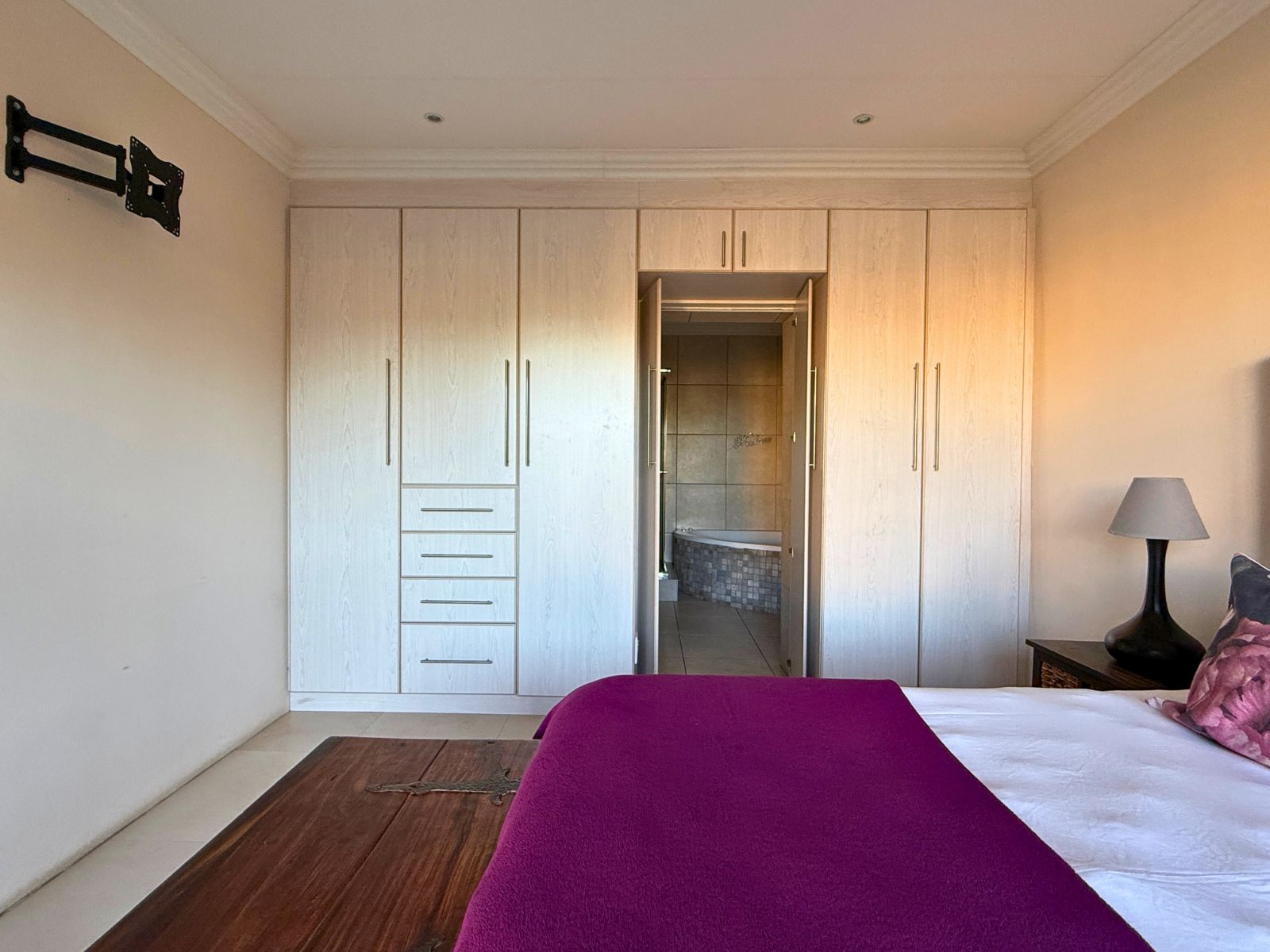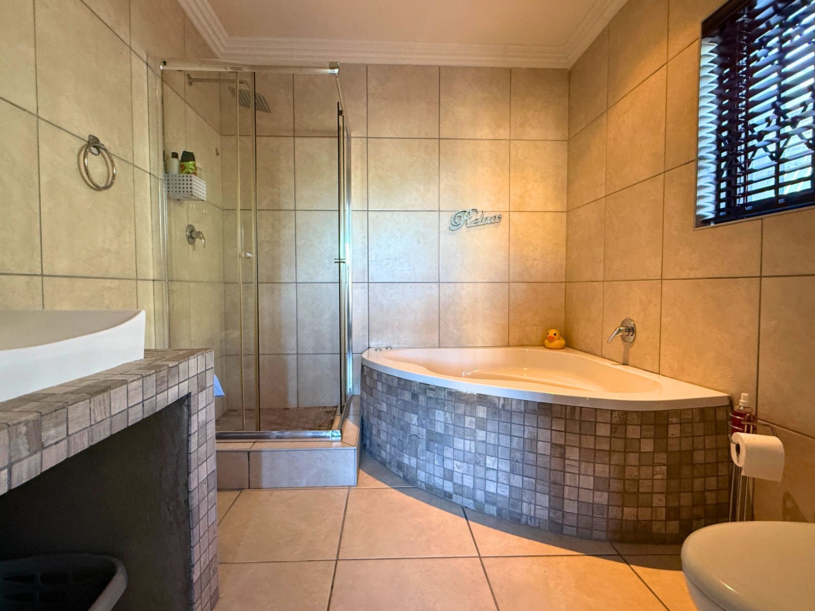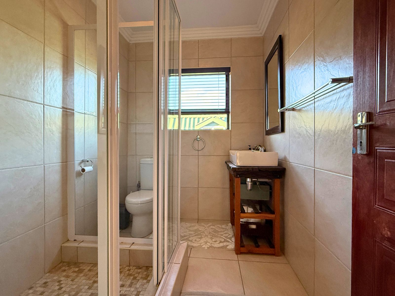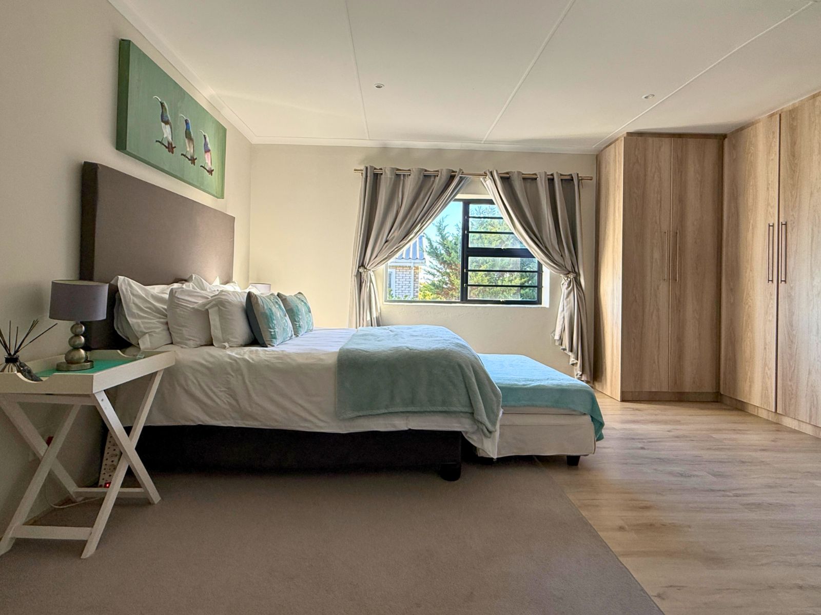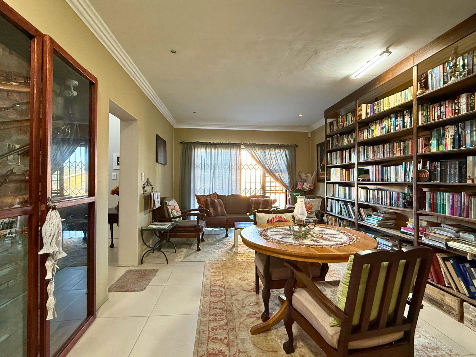At the heart of the home lies a modern kitchen that is as functional as it is stylish, with stunning granite countertops, ample cabinetry, and a dedicated pantry for additional storage. Just off the dining area, you’ll discover a spectacular enclosed entertainment space, perfect for relaxed socializing. With folding stacker doors that seamlessly open to a beautiful garden complete with fruit-bearing grapevines, this space is designed for effortless indoor-outdoor living. It’s complemented by a built-in braai, prep bowl, and basin, making it an entertainer’s dream.