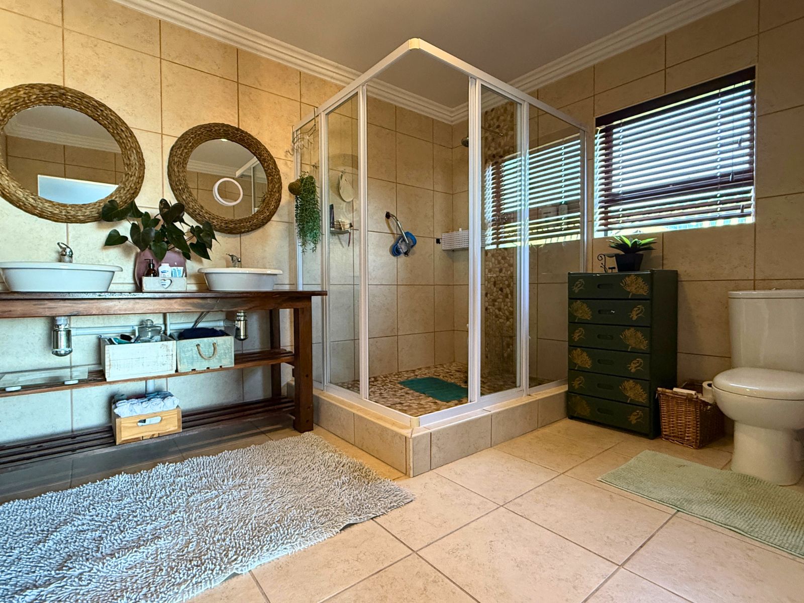 The interior exudes a sense of spaciousness and warmth, offering six generously sized bedrooms and 4.5 bathrooms. Three of the bedrooms enjoy the luxury of stylish en-suite bathrooms, while a fourth full bathroom is conveniently shared by three additional bedrooms. A guest toilet ensures ease and comfort for visitors. With a combination of sleek floor tiles and warm PVC flooring, the home is both practical and refined.