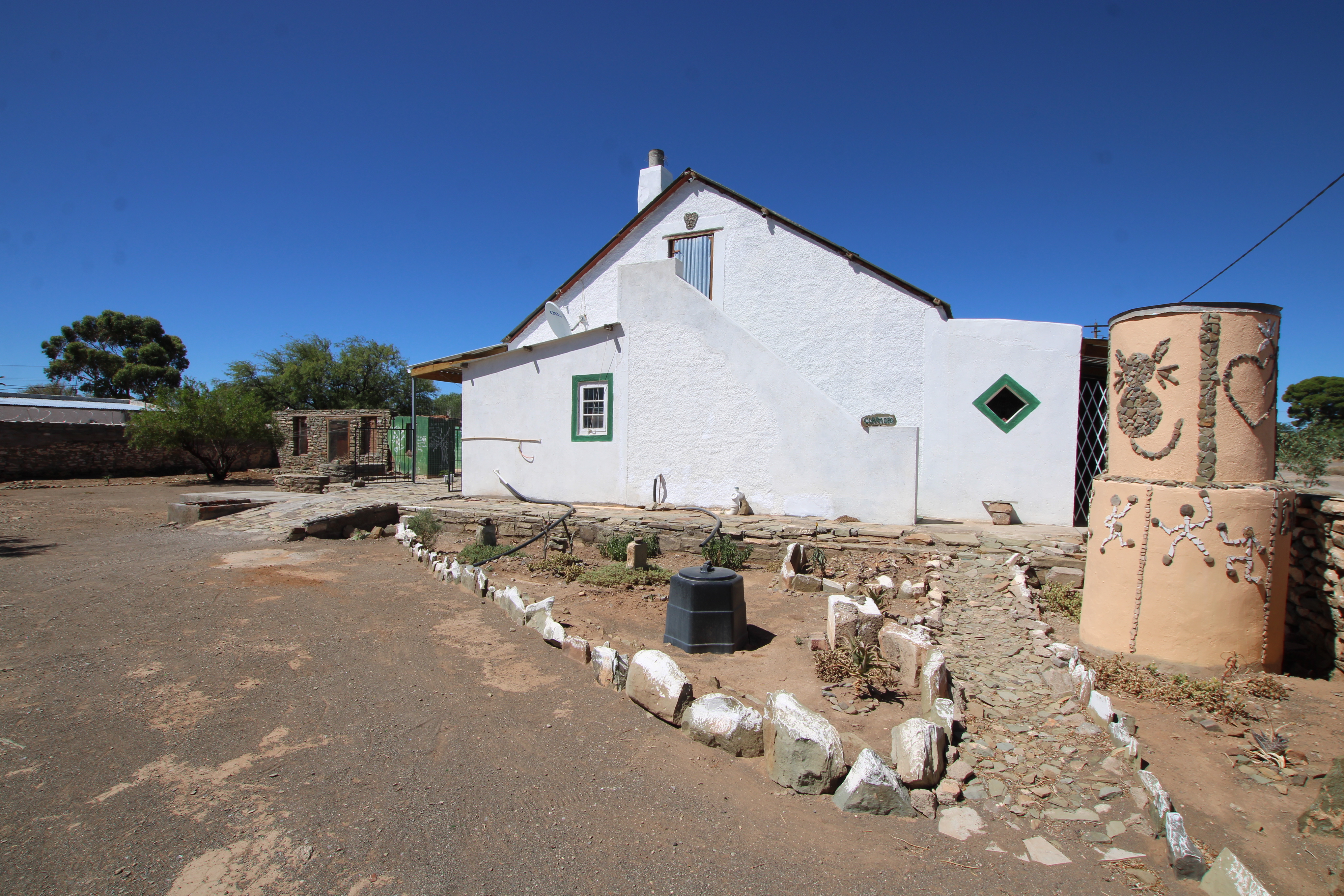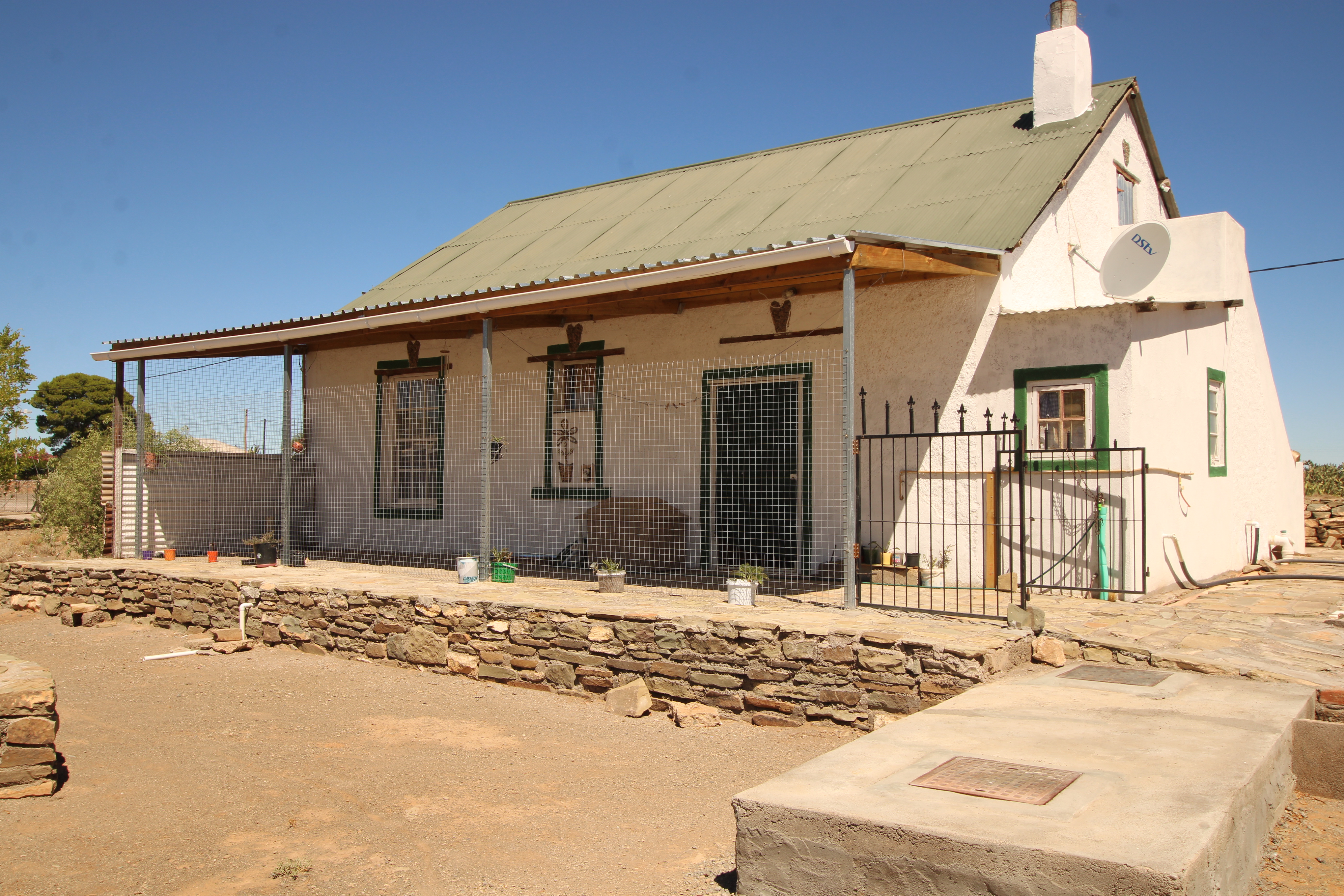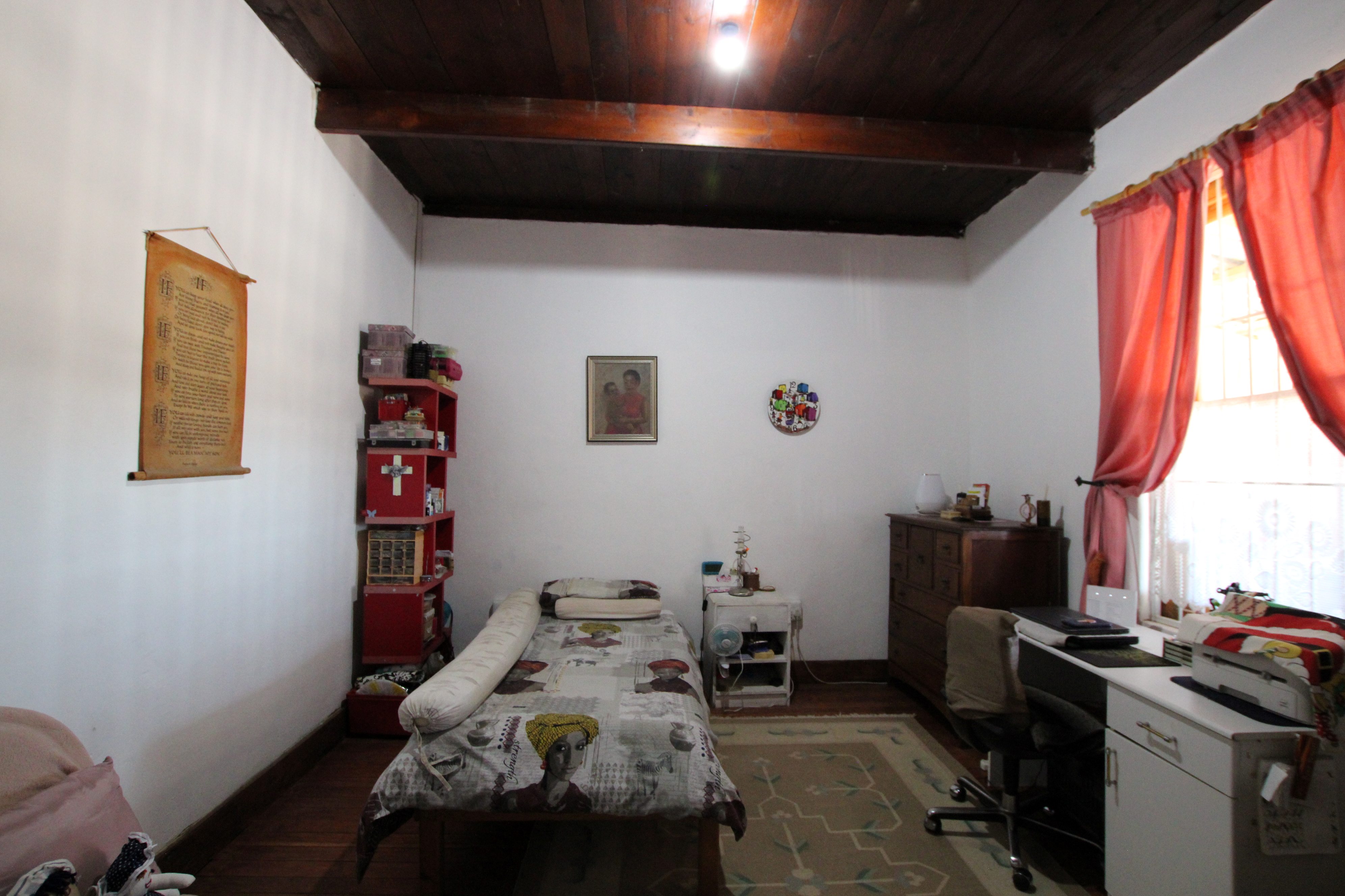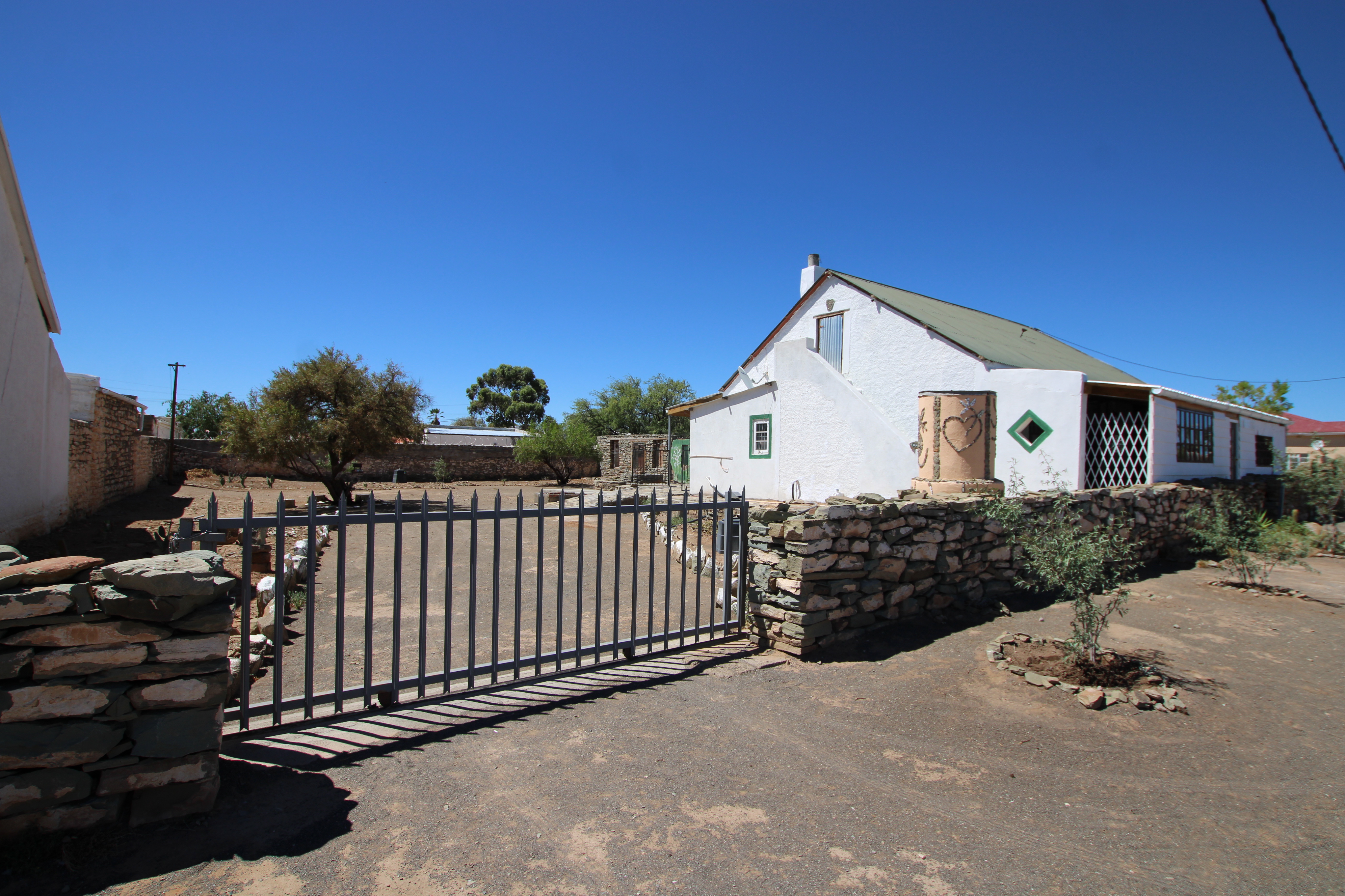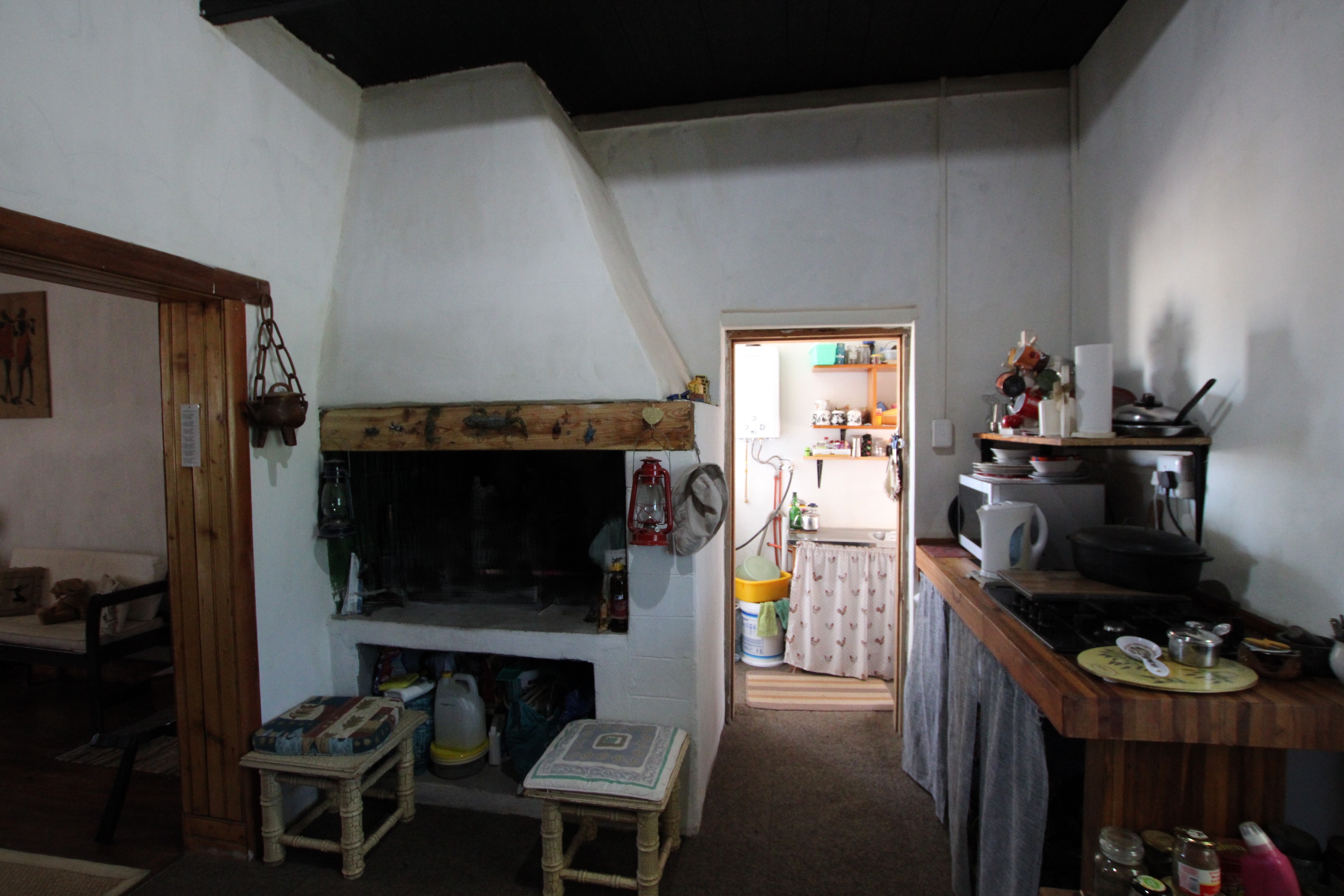Set on a generous 793-square-meter, this charming home blends characterful historic features with thoughtful modern additions. Upon entering, you are welcomed by an enclosed porch that offers both enhanced privacy and an airy, extended living space perfect for relaxation. The interior boasts original wood flooring and high organ wood ceilings that create a sense of warmth and volume. The hallway features built-in shelves. The layout includes two bedrooms, highlighted by a master suite with a private ensuite bathroom. At the heart of the home, an open-plan living and dining area connects seamlessly via an archway to a unique kitchen, which features an indoor "braai" ideal for year-round entertaining and warmth. The property is as practical as it is inviting, offering a dedicated pantry, a tucked-away sink, and a convenient attic/loft for seasonal storage. Outside, the functionality continues with secure parking on the back porch—fully enclosed by wired fencing and dual gates—and a spacious backyard perfect for gardening or pets. Adding to the property's potential is a stone outbuilding that, with a bit of restoration, provides excellent additional storage or workshop space.