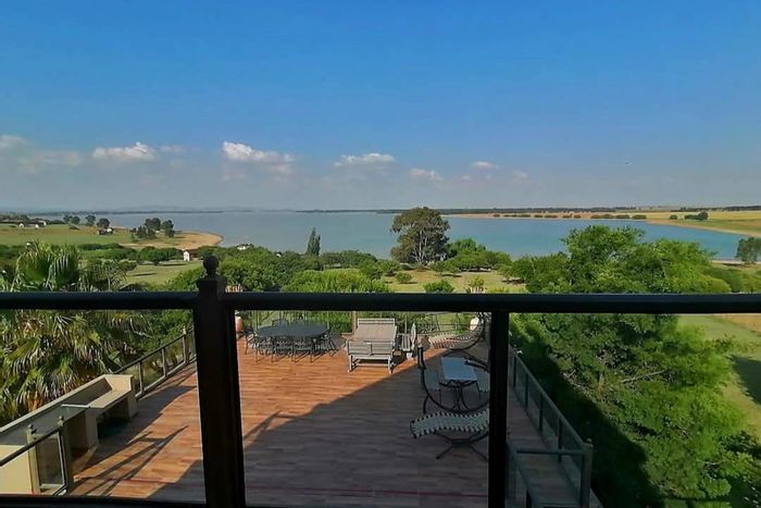 Lakeside retreat at Vaal Dam offering shared ownership and uninterrupted 180° water views, 100m private frontage, pool, game-rich indigenous grounds, and four en-suite bedrooms for 12.