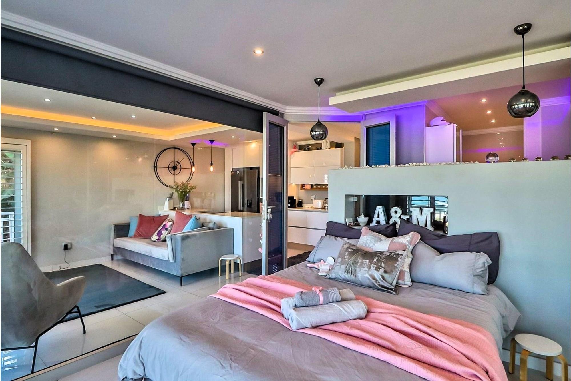The master bedroom features a captivating glass wall that separates it from the lounge, creating an atmosphere of modern sophistication. Handpicked furniture adorns the interior, perfectly complementing its stylish ambiance.