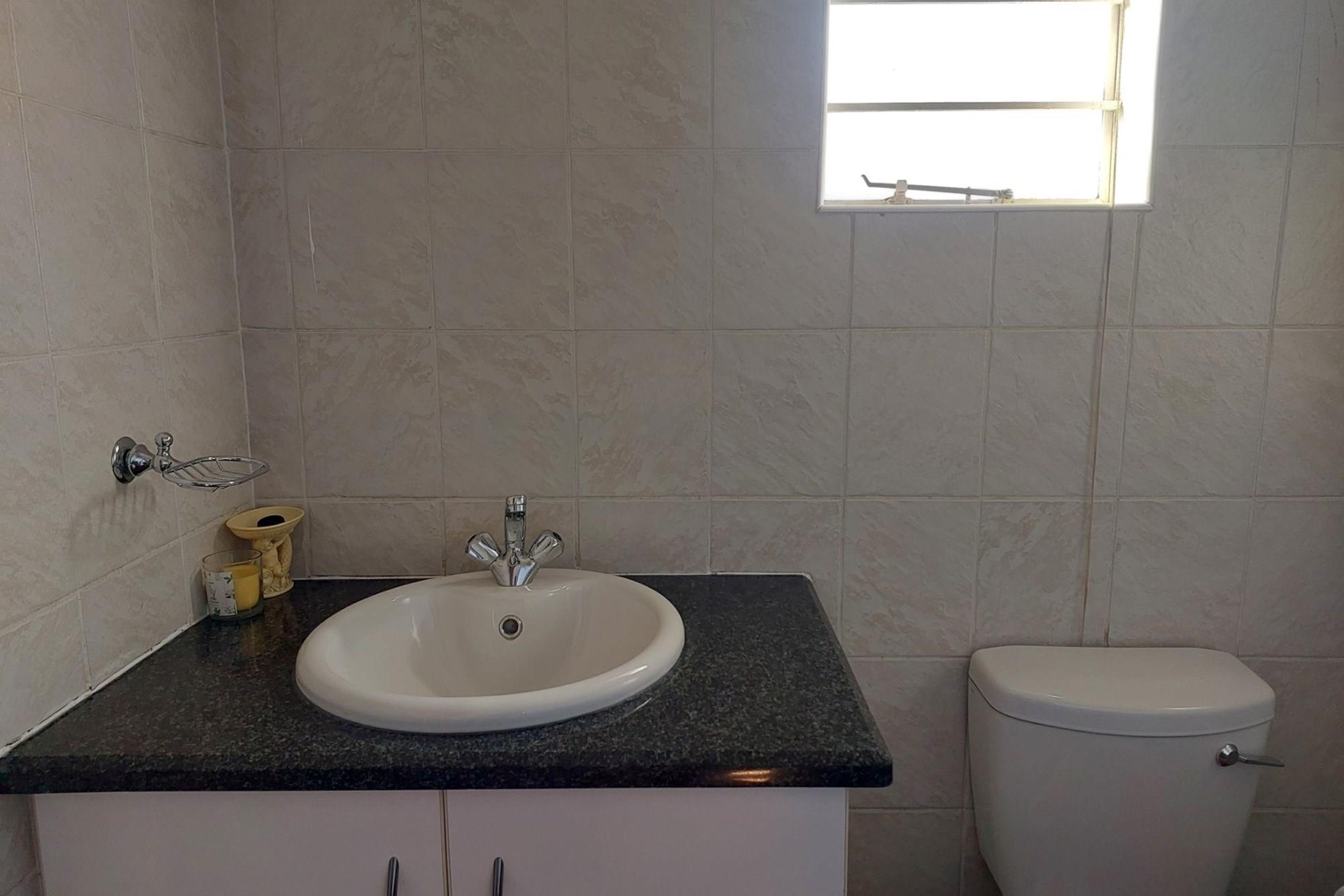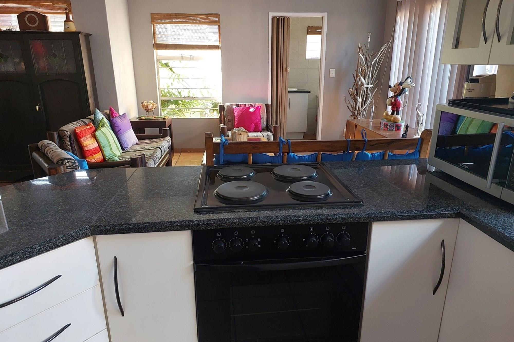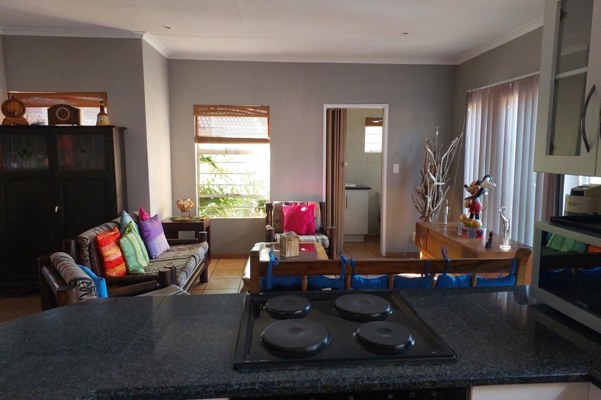 Entering through the front door, you find a large open plan area where the kitchen, dining room and lounge is situated. This whole area is tiled and there are blinds in front of all the windows. The kitchen has granite tops, a hob, an under counter oven and there is a connection for a washing machine. There is also a guest toilet with a basin just off the lounge. Both bedrooms are spacious and tiled with built in cupboards and the single bathroom offers a shower, basin and toilet.