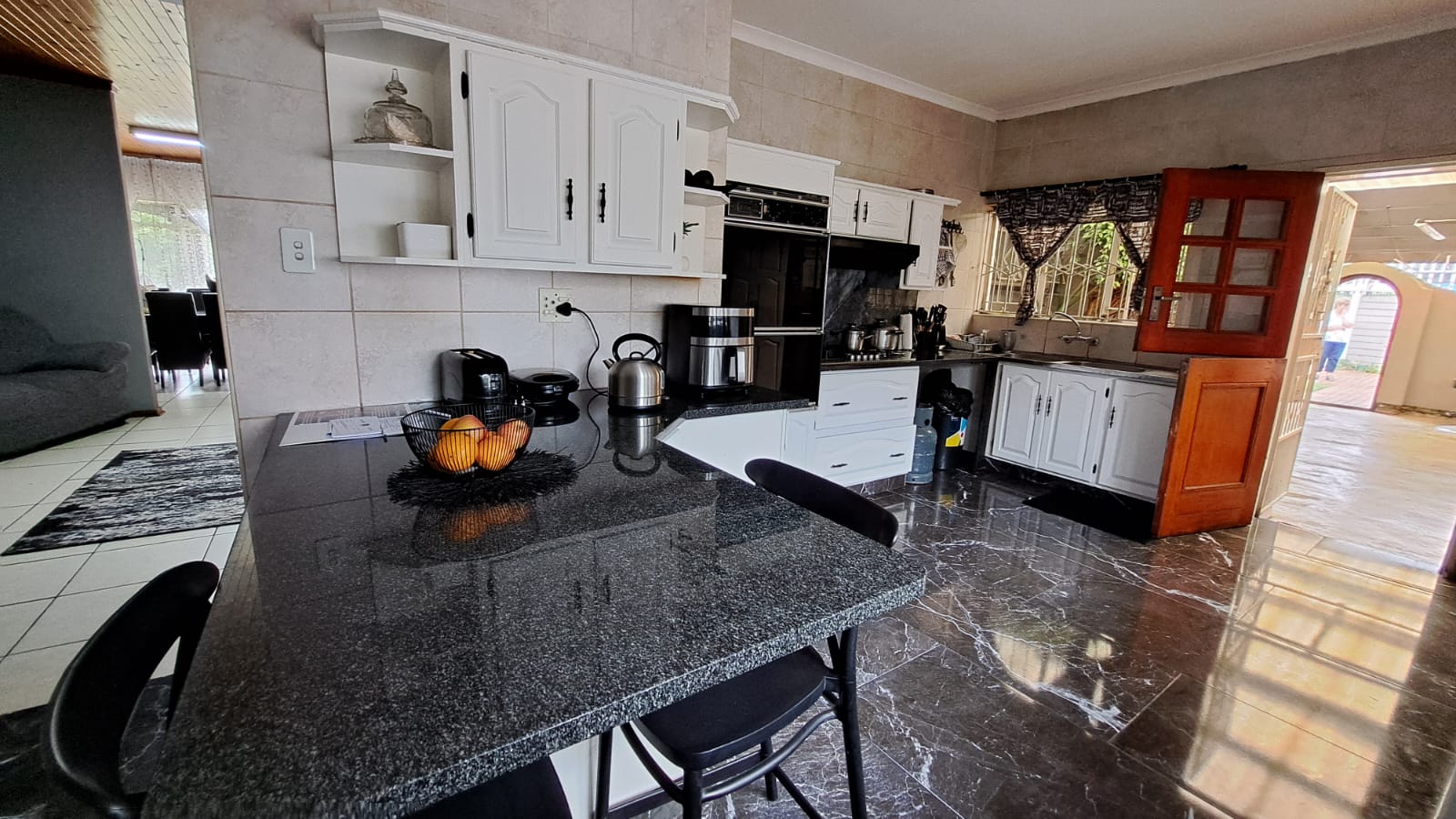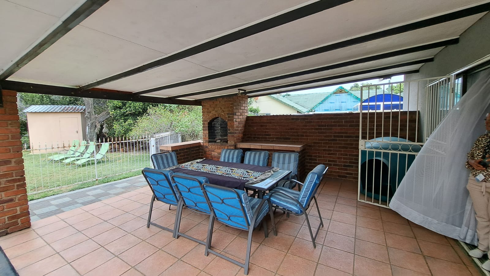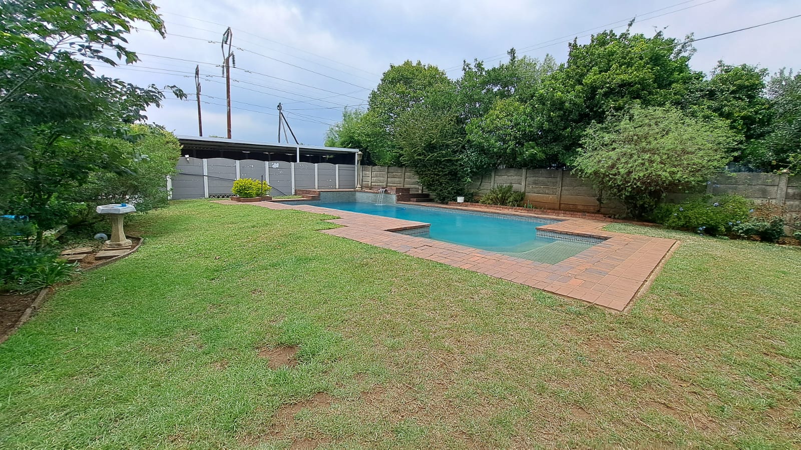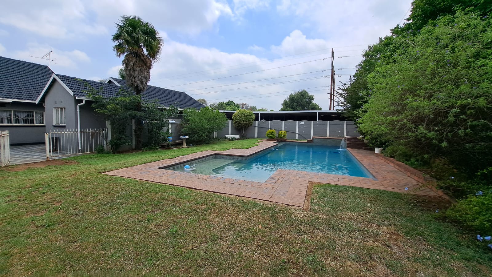 Entertainment Ready – Sliding doors lead to a covered patio with built-in braai, overlooking the marbelite swimming pool (fenced for safety).