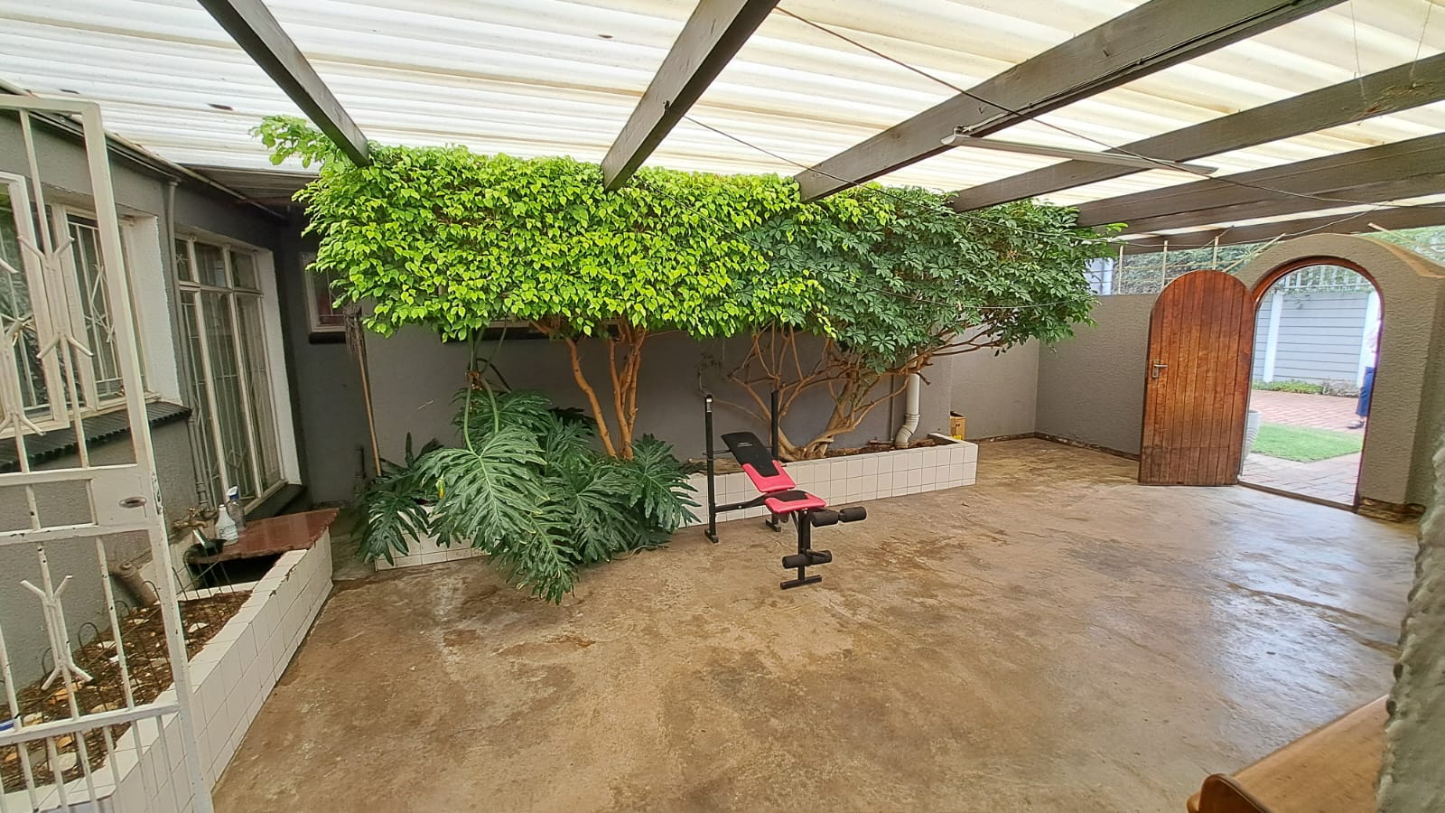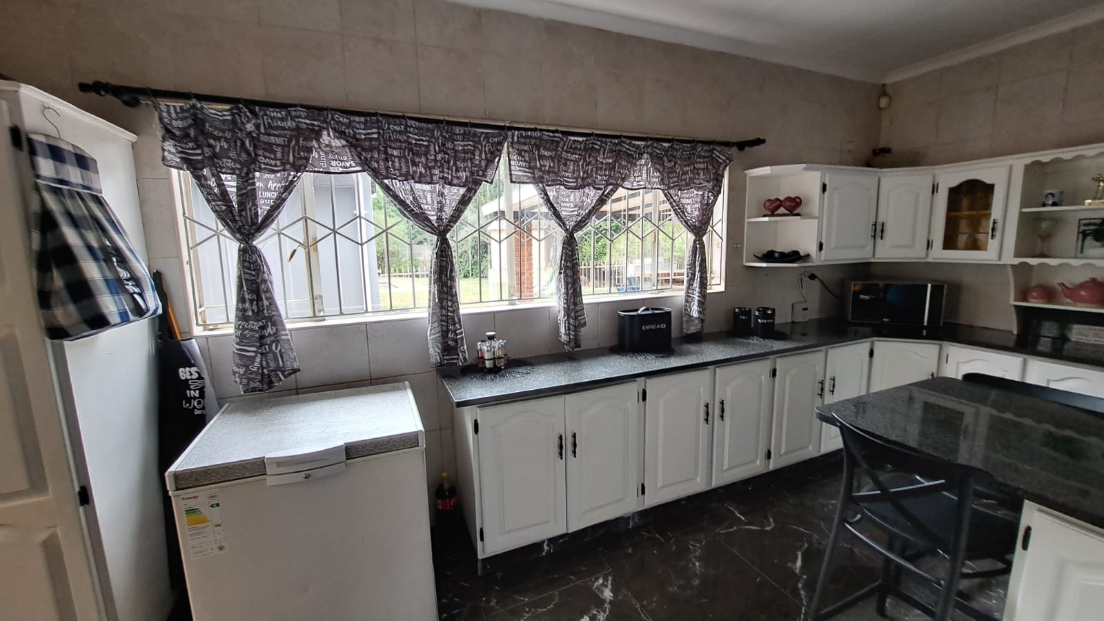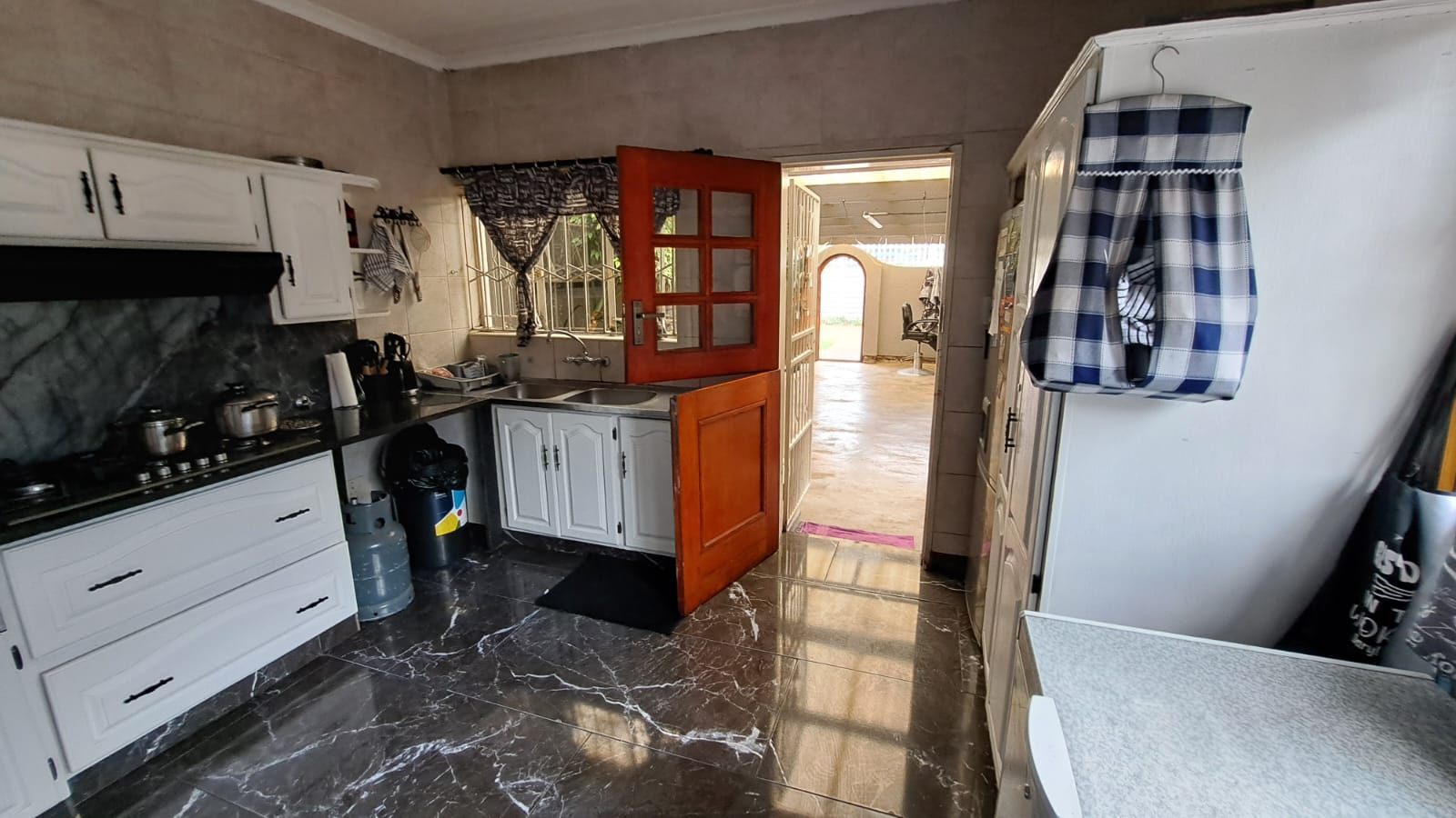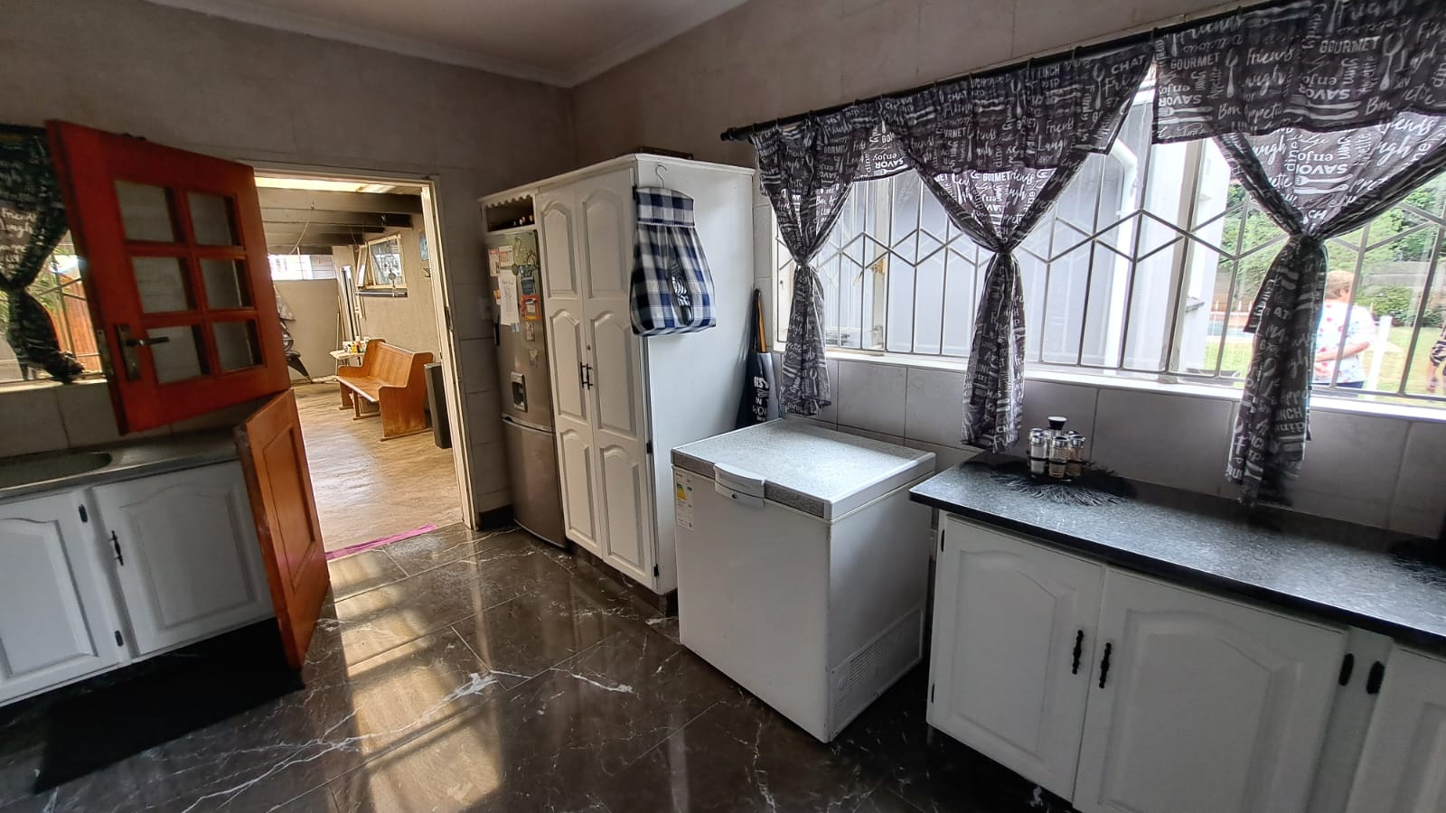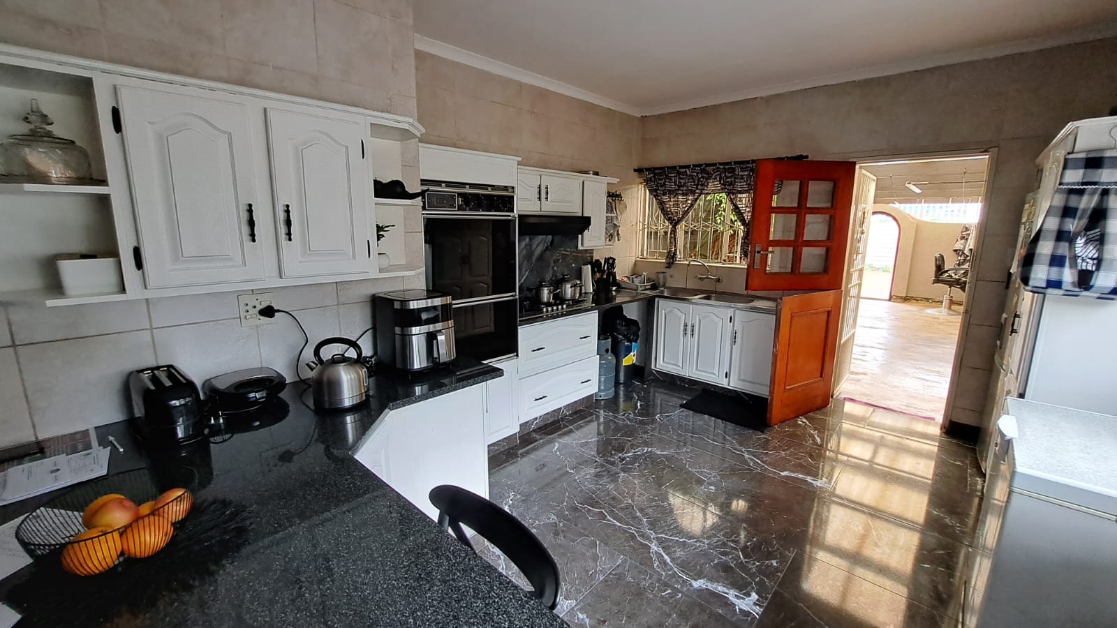 Entertainment Ready – Sliding doors lead to a covered patio with built-in braai, overlooking the marbelite swimming pool (fenced for safety).