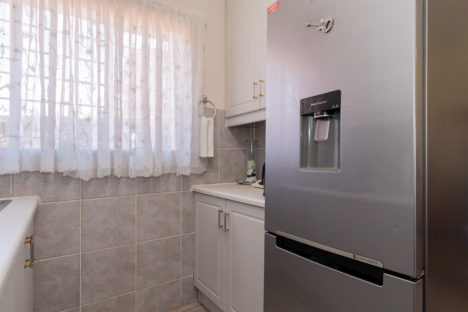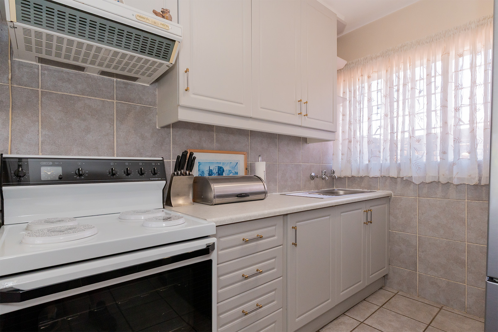 - Immaculately kept tiled kitchen, with built-in cupboards, breakfast nook, sleek countertops and freestanding 4 plate stove and oven