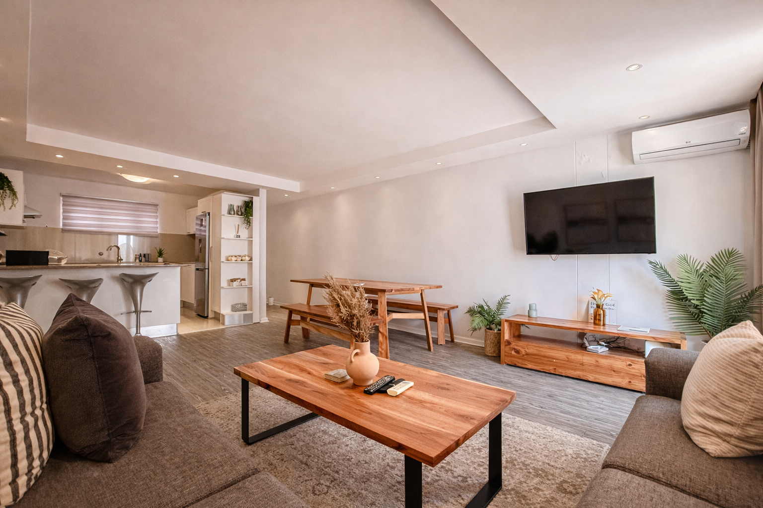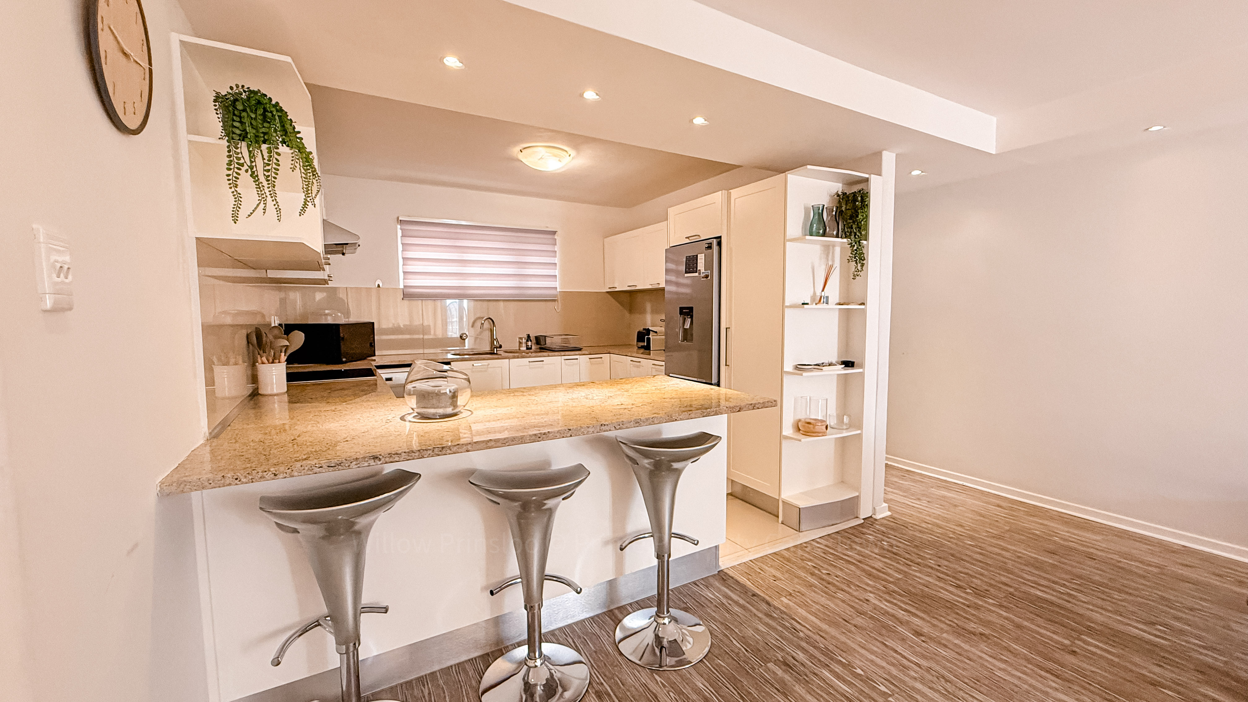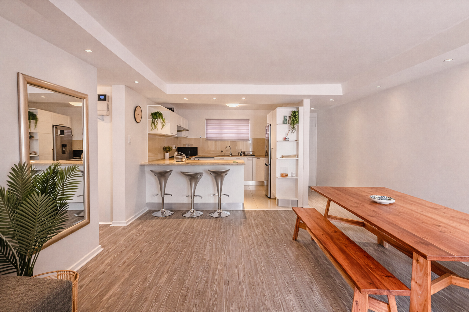 The apartment features a clean, contemporary interior with tasteful, well-maintained furniture that feels fresh and inviting from the moment you step inside. The open-plan living area is thoughtfully designed for both everyday living and easy entertaining, flowing effortlessly into a sleek, modern kitchen equipped with everything you need.