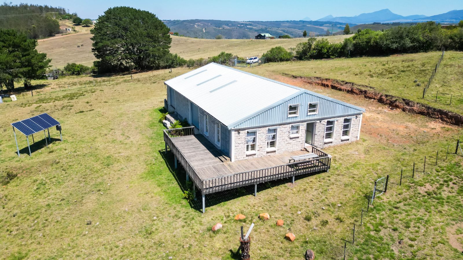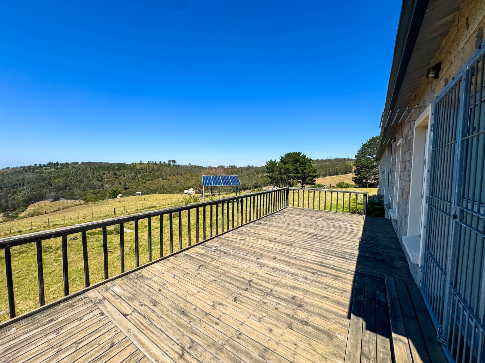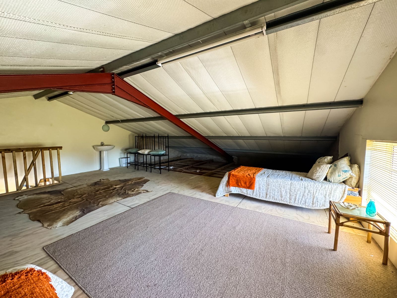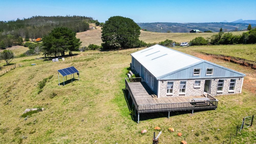 The main building, constructed just six years ago, thoughtfully combines practical storage with comfortable living. The residential space features a spacious open-plan kitchen, dining, and lounge area that creates a warm and inviting atmosphere. It includes a large bedroom with an ensuite bathroom, a separate guest toilet, and a versatile loft room that can easily serve as an additional bedroom or be converted to include an upstairs bathroom. An expansive deck wraps around two sides of the building and features a built-in braai, perfect for entertaining while enjoying the scenic views of the surrounding Outeniqua Mountains.