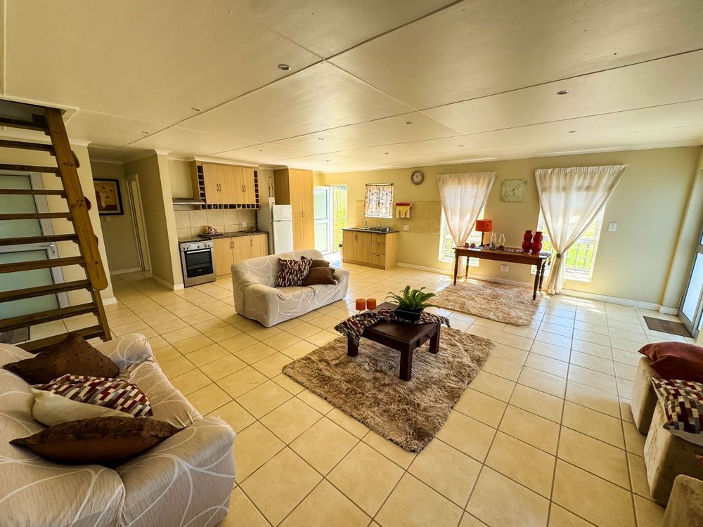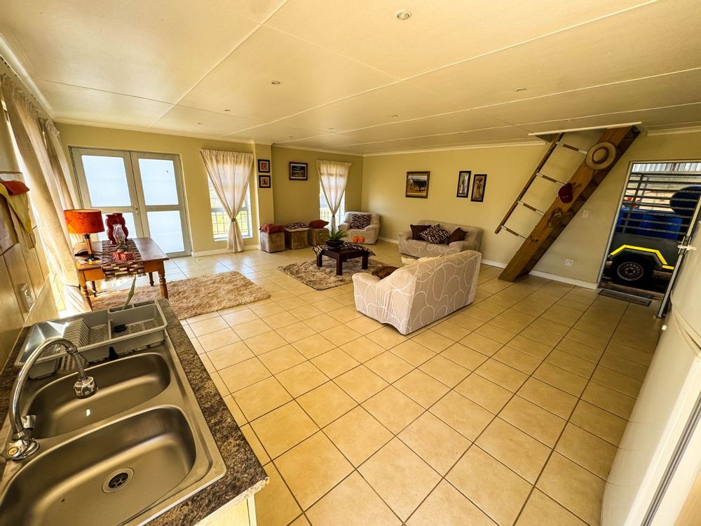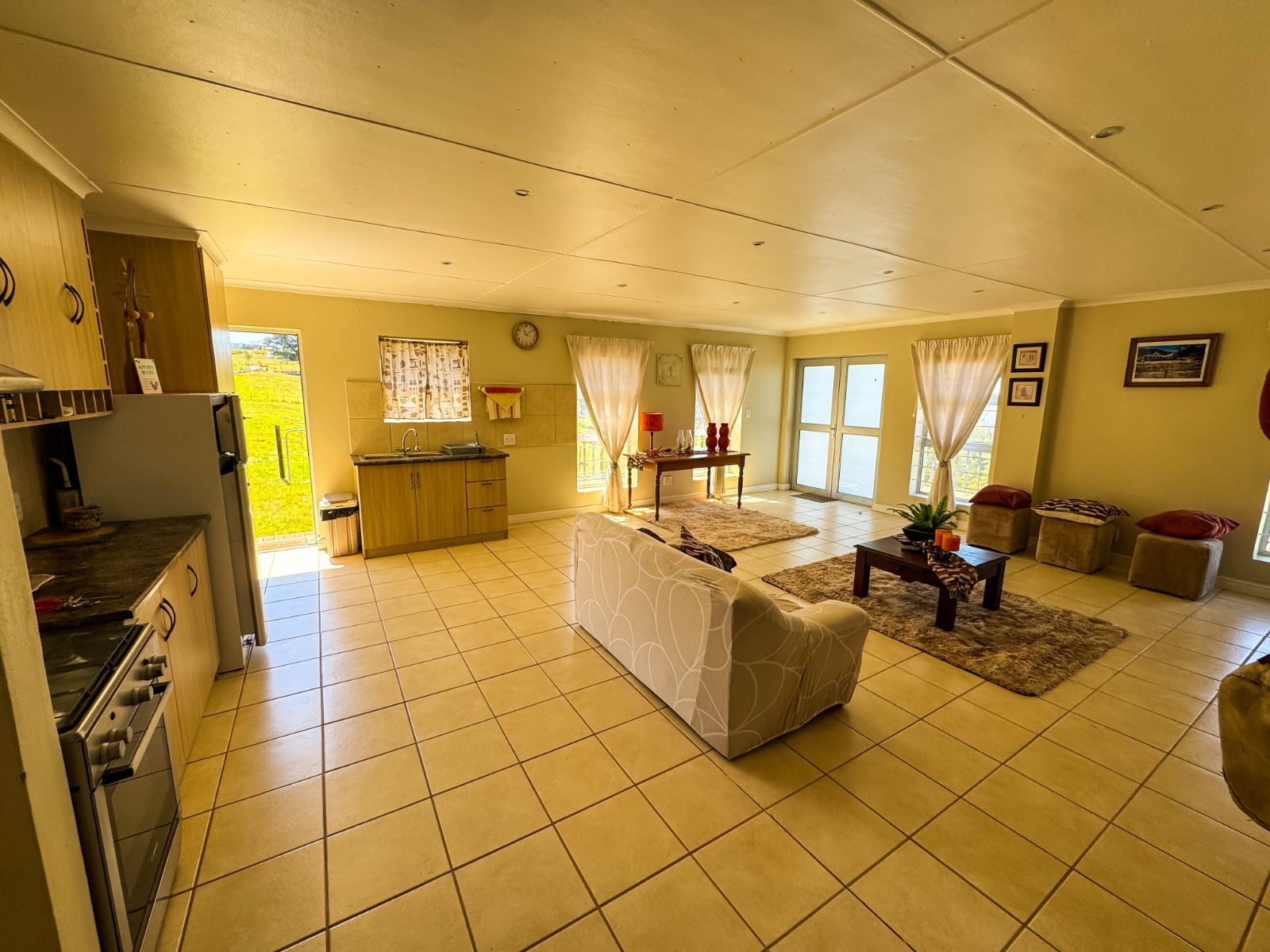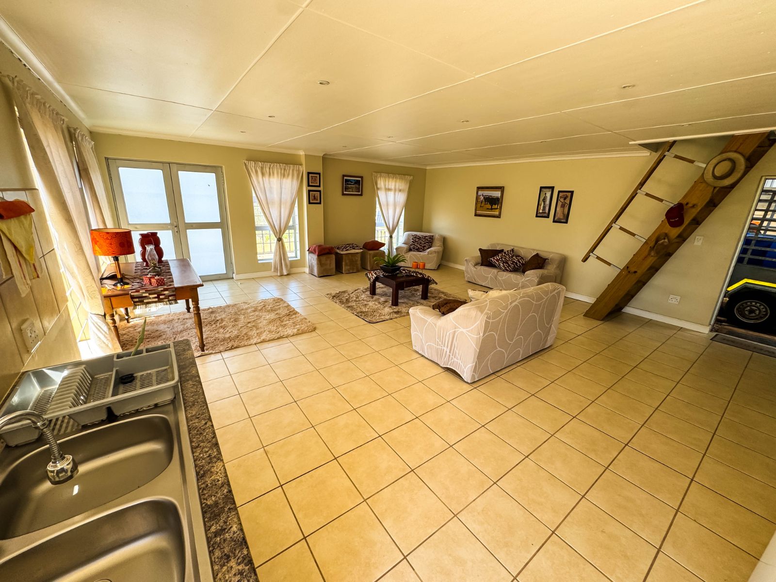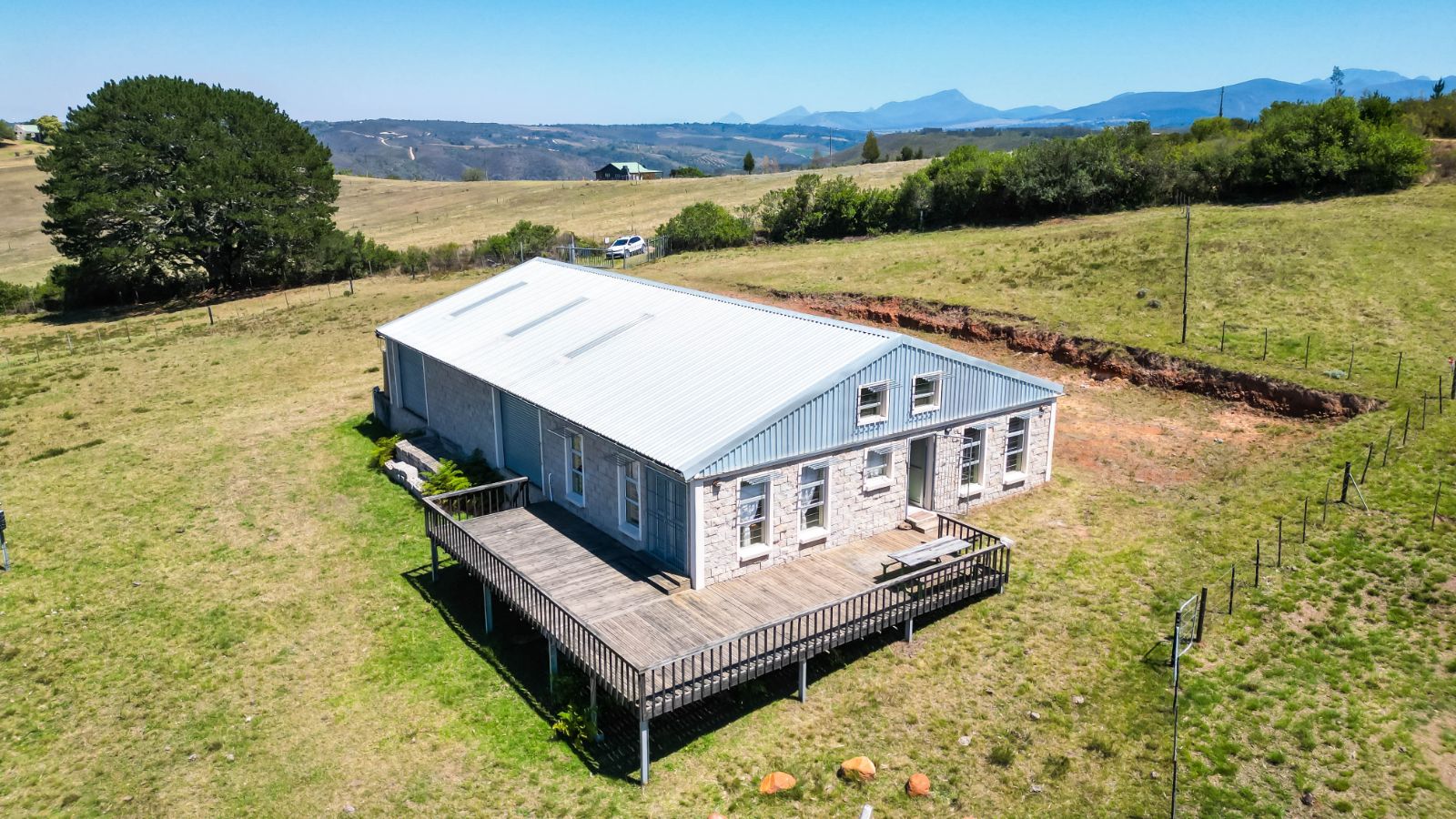 The main building, constructed just six years ago, thoughtfully combines practical storage with comfortable living. The residential space features a spacious open-plan kitchen, dining, and lounge area that creates a warm and inviting atmosphere. It includes a large bedroom with an ensuite bathroom, a separate guest toilet, and a versatile loft room that can easily serve as an additional bedroom or be converted to include an upstairs bathroom. An expansive deck wraps around two sides of the building and features a built-in braai, perfect for entertaining while enjoying the scenic views of the surrounding Outeniqua Mountains.