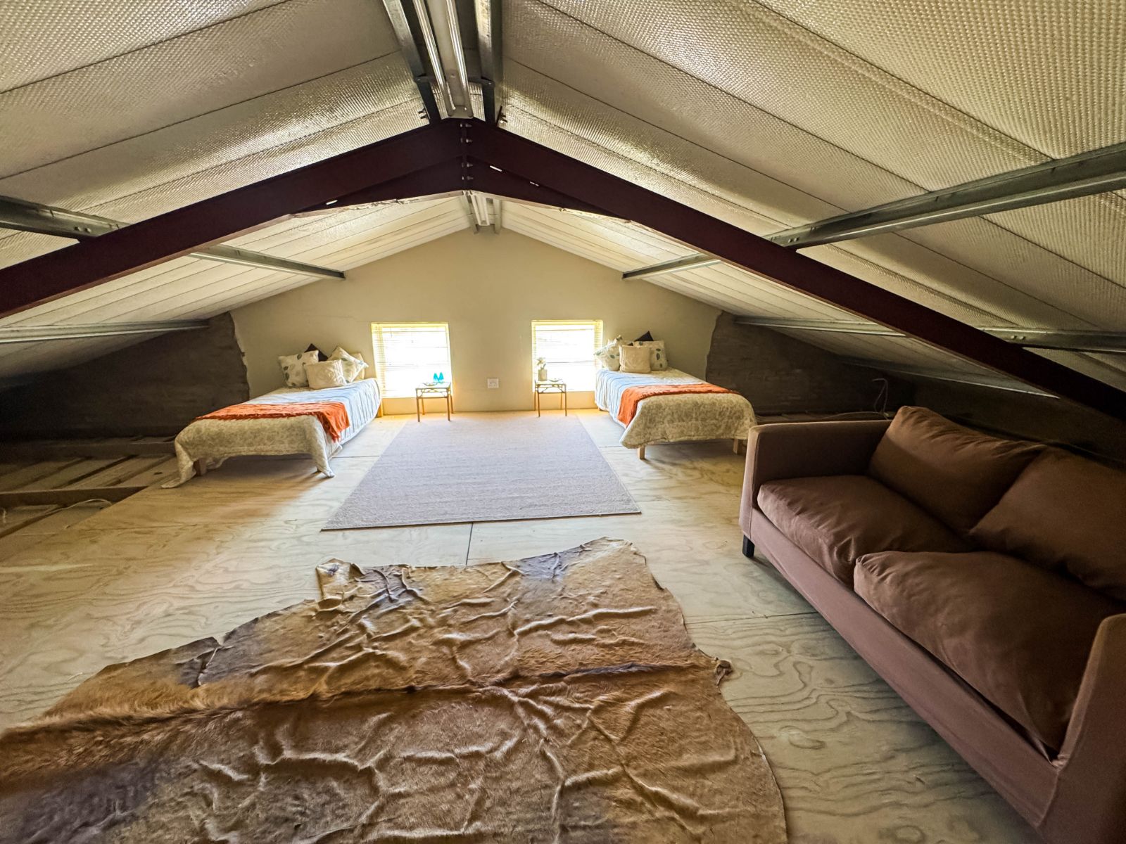 Sustainability is at the heart of this home. A reliable three-year-old borehole provides a steady supply of fresh water, which is efficiently distributed to the camps via a gravity-fed system. Rainwater is harvested from the large roof into six 5,000L tanks, ensuring an ample water supply for the main building. The entire property operates off-grid, thanks to a 3kV solar system that powers the borehole pump and all household electricity needs. For modern convenience, the kitchen is equipped with a gas-powered fridge, stove, and geyser, which are all included in the sale.
