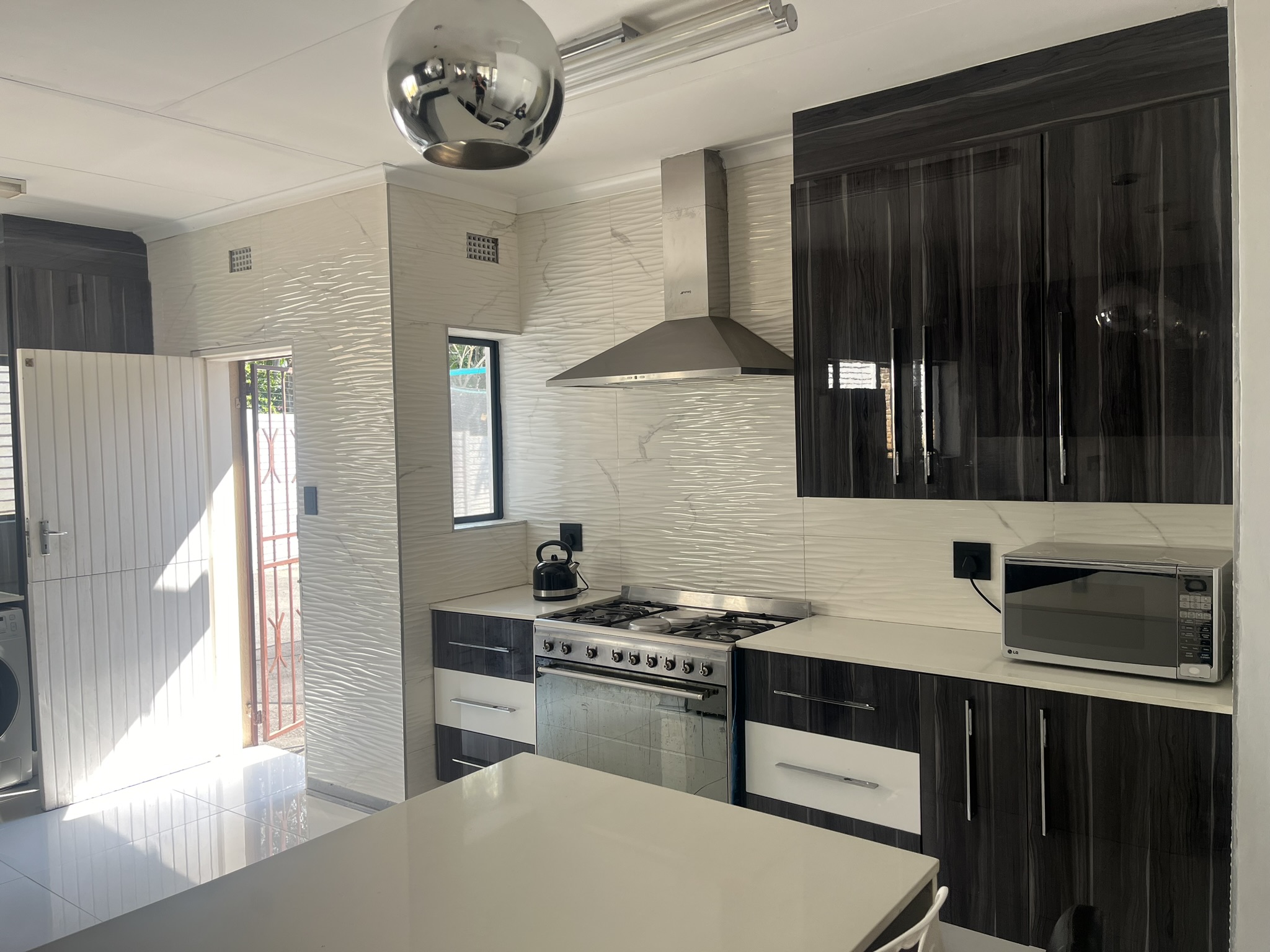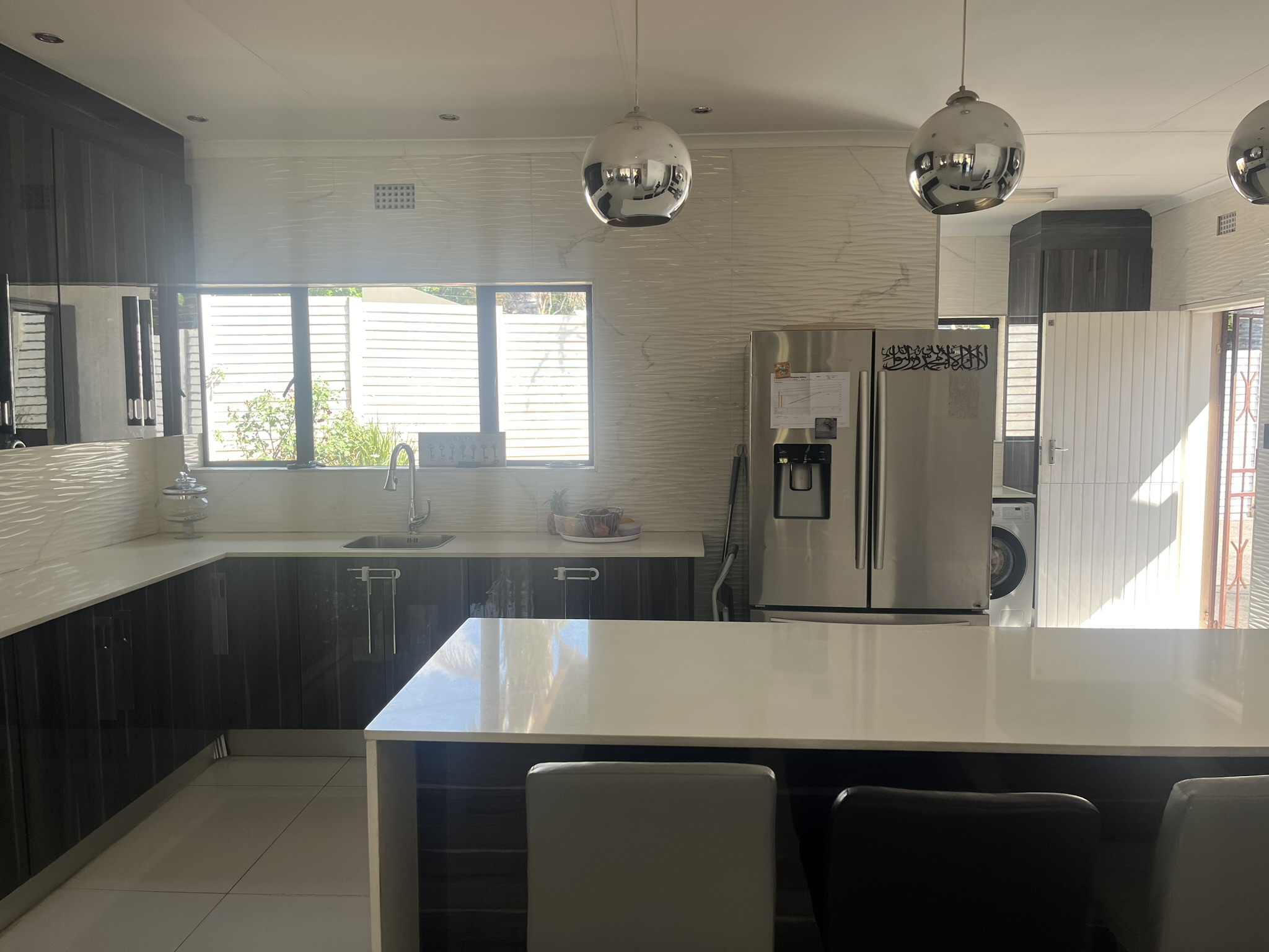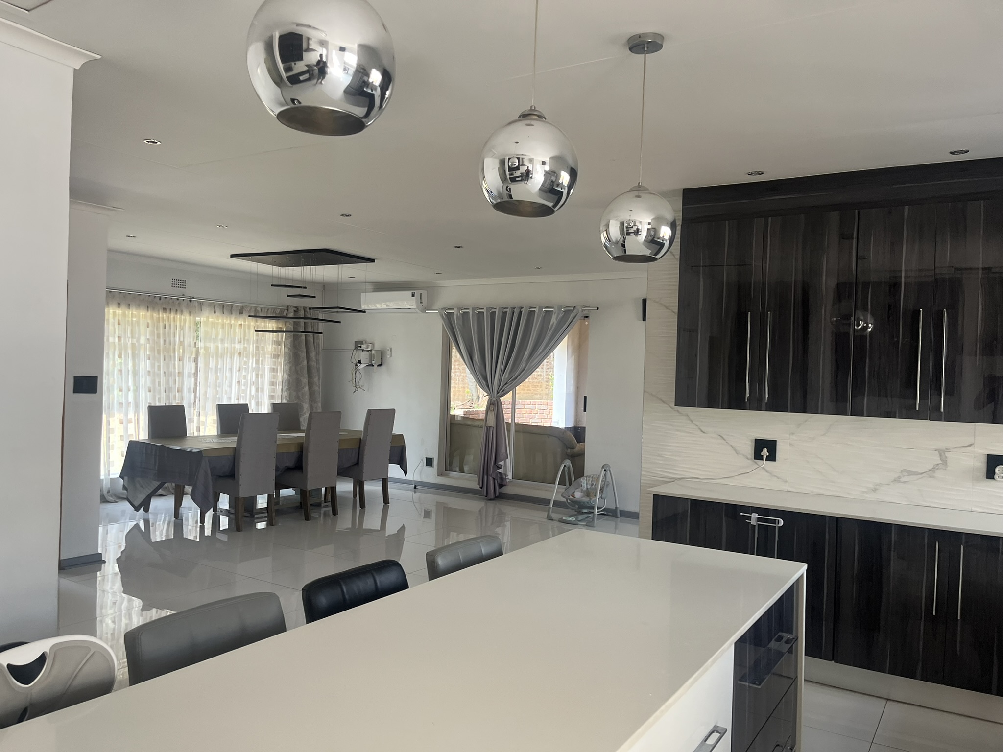 This bright and open-flowing house is located at the top of a gated cul-de-sac, which is also within a security boomed neighborhood. With a large reception that leads to the full kitchen and lounge to the side.