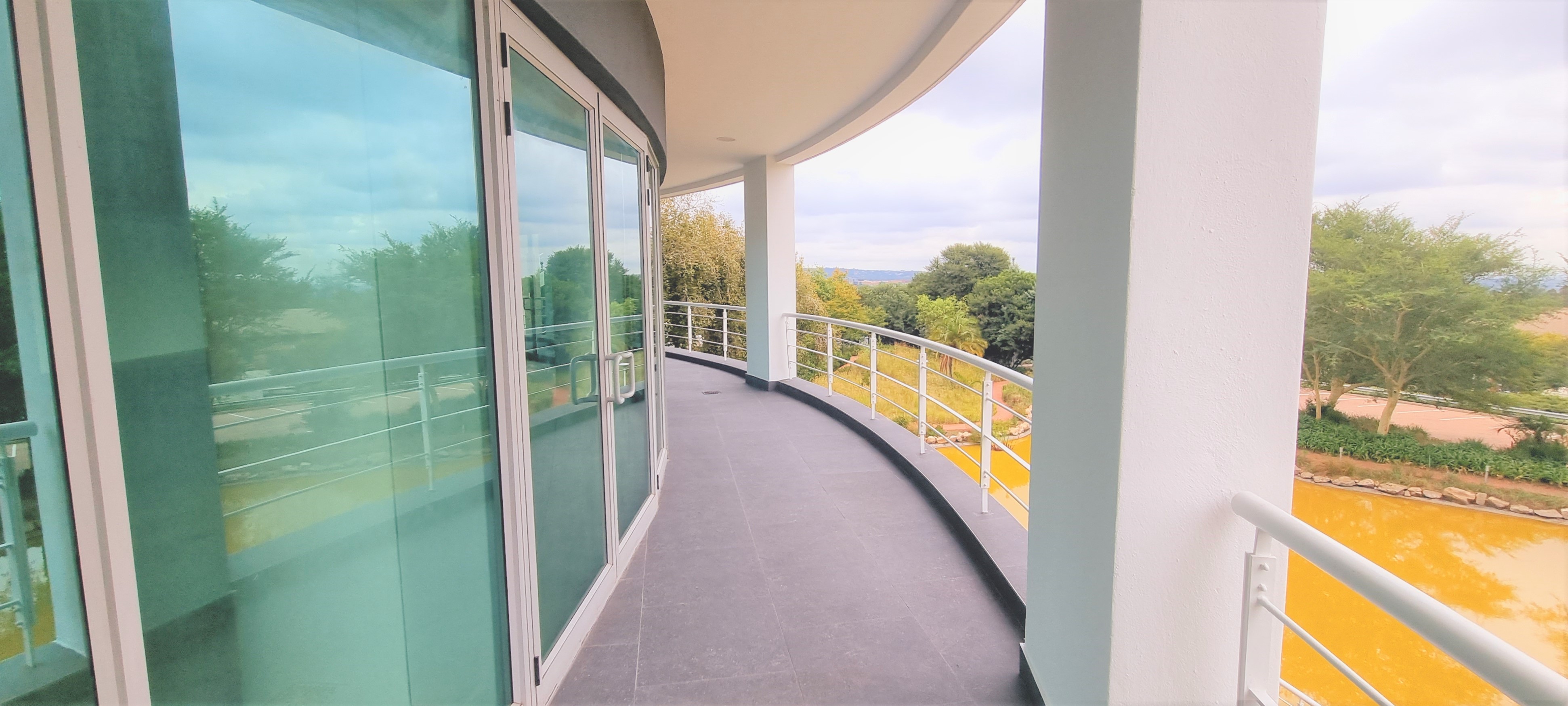 A notable feature is the large terrace overlooking a serene private dam, home to various bird species—providing a tranquil