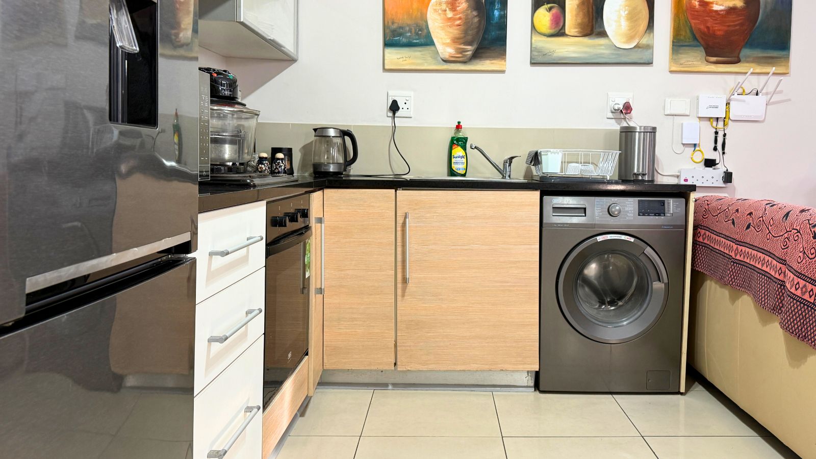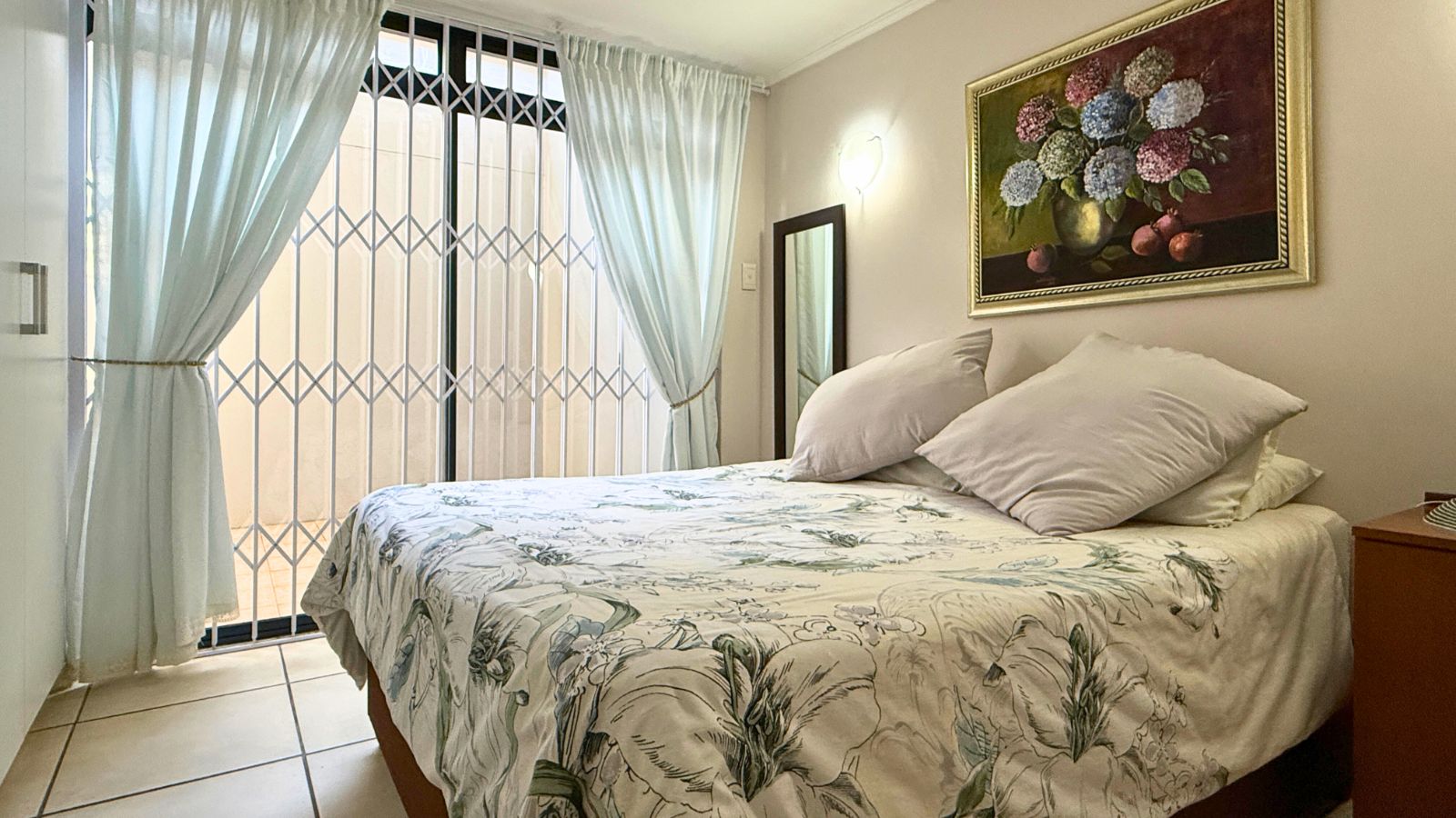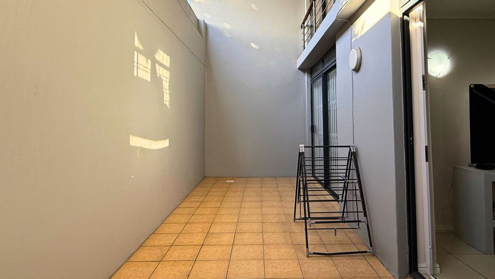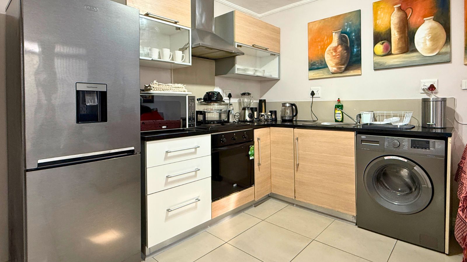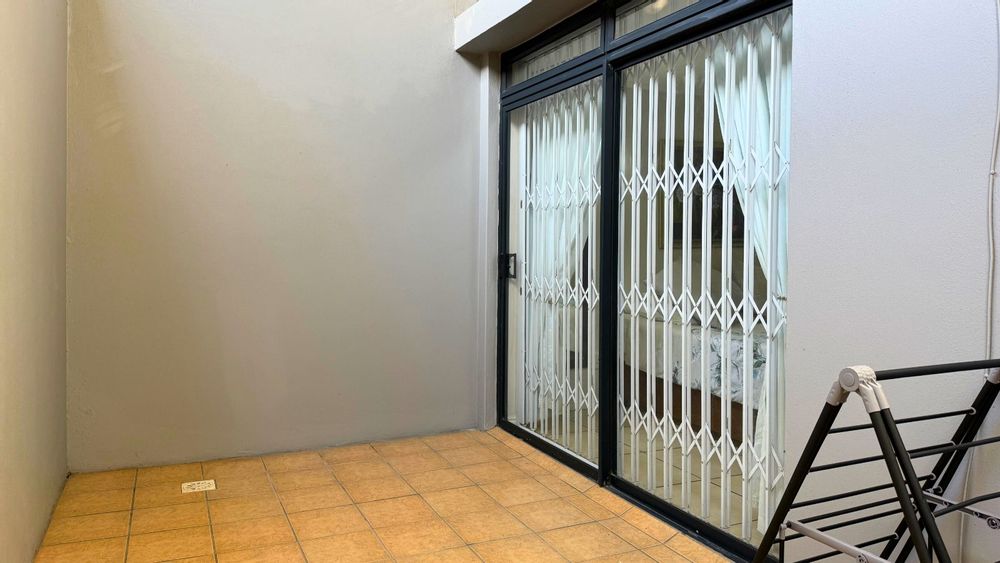 The open plan layout creates a light and welcoming atmosphere, with a modern kitchen featuring granite countertops that flows seamlessly into the lounge and dining area. Sliding doors open to a semi enclosed patio fitted with security gates, offering a private and versatile outdoor space.