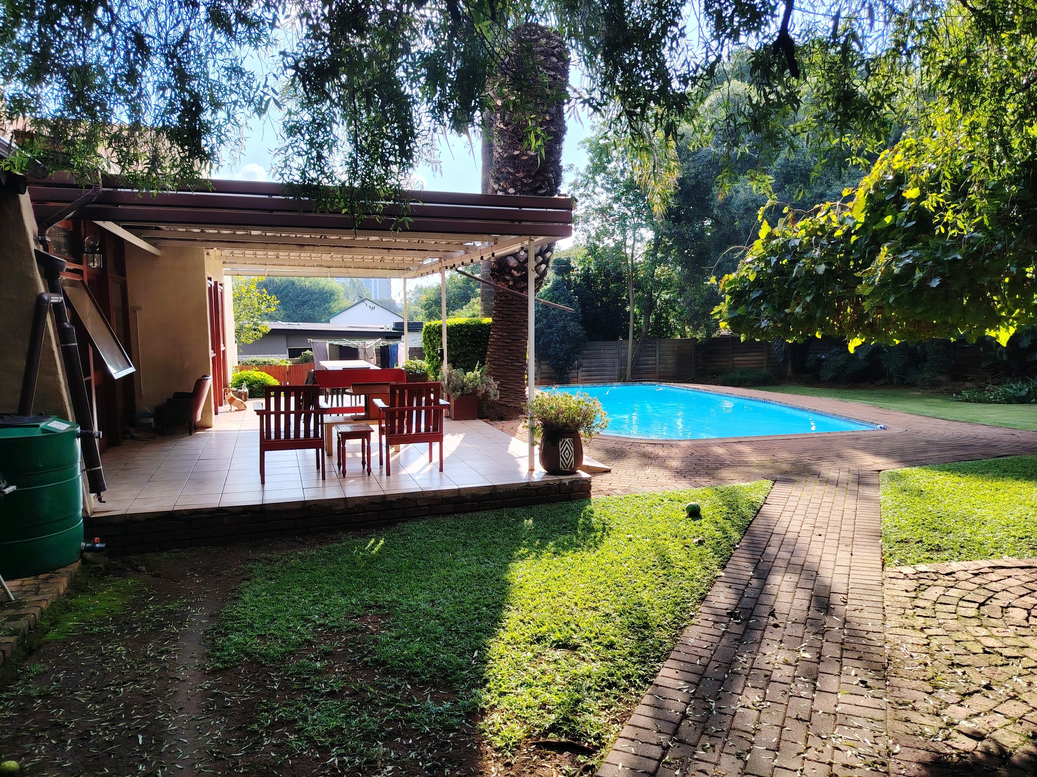 Sparkling pool, and lush garden.