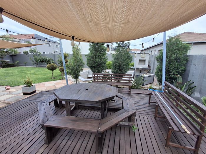 Entertainer's dream in Theresapark Golf Estate, Akasia — secure living with leafy fairways, patio with built-in braai, sunken firepit and swimming pool. Four bedrooms, two baths, three garages.