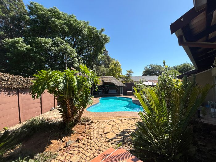 Relax and entertain outdoors in a leafy suburb retreat with a thatched lapa and sparkling pool, modern granite kitchen, private garden — three beds, two baths, double garage.