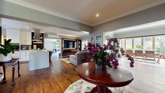 Privately positioned on Leith Road, this double-storey full-title home sits on one of the estate’s largest stands with soaring double-volume north-facing living, pool, built-in braai and staff accommodation.