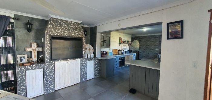 Entertainer's haven with three lapas and built-in braai, rock-feature pool, two entertainment rooms and exposed beams, fully paved with alarm and electric fence. 3 beds, 2 baths, covered parking.