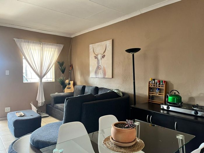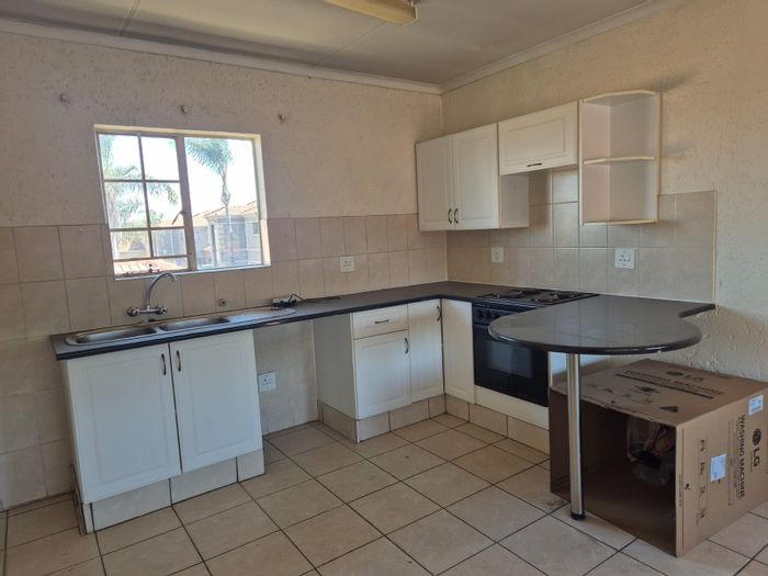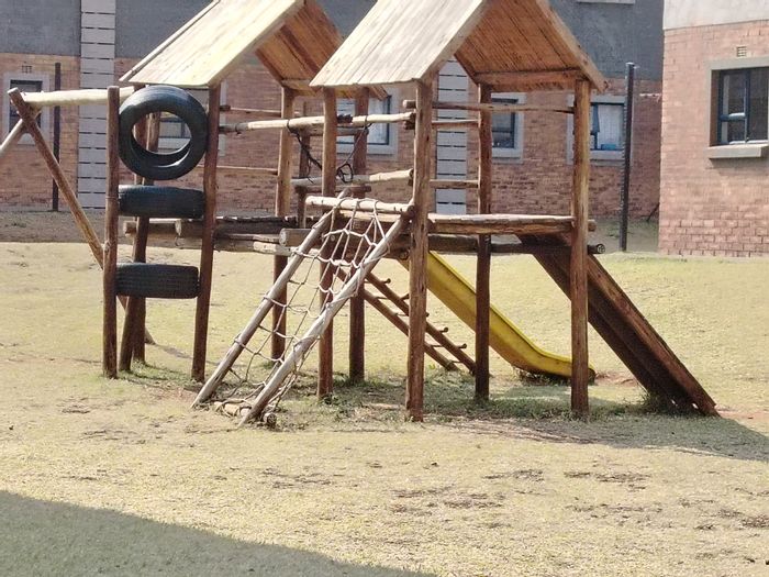 Access-controlled Greenleave estate near Carnival City and Mall — family-friendly complex with secure play areas, gas stove, energy-saving geyser and borehole backup. Two beds, one bath, one carport.