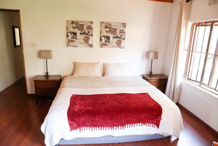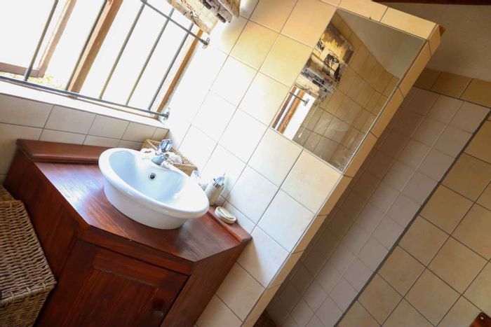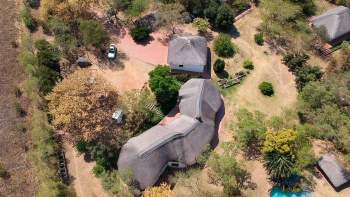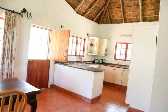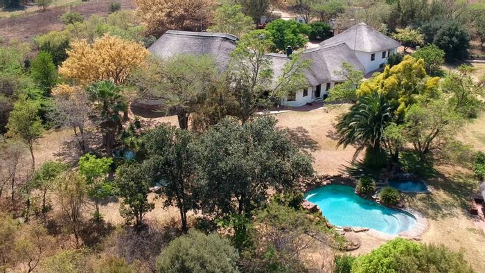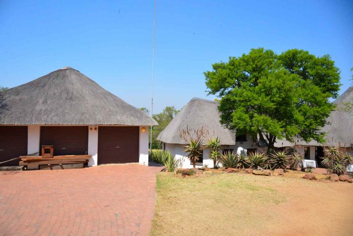 Escape to resort-style country living on 10ha, 20 minutes from Hartbeespoortdam, with sunrise views, thatched main house and cottage and a private tennis court; 8 beds, 5 baths, triple garage.