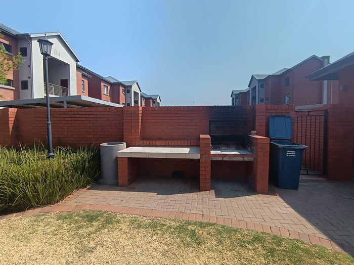 Sophisticated apartment near Irene Mall and top schools, with enclosed patio and built‑in gas braai for year‑round entertaining; communal pool, children’s play area, two covered carports, 2 beds, 1 bath.
