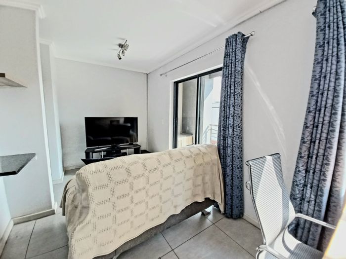 Relaxed top-floor living near OR Tambo with secure complex amenities and a pool; open-plan kitchen flows to balcony with gas braai — sunlit bedroom, private storeroom and covered parking.