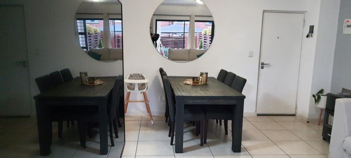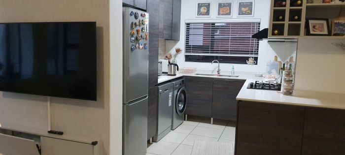 Entertain effortlessly with open-plan living and a private garden in Modderfontein, Edenvale — close to Greenstone Mall, with a modern kitchen, three bedrooms, two bathrooms and double covered parking.