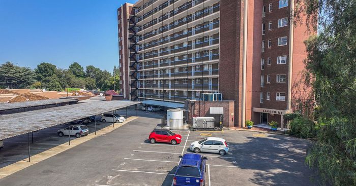 Renovated 5th-floor apartment opposite Germiston Lake with lake views, sleek open-plan kitchen, communal pool, lapa with built-in braai and covered parking — two bedrooms, two baths.