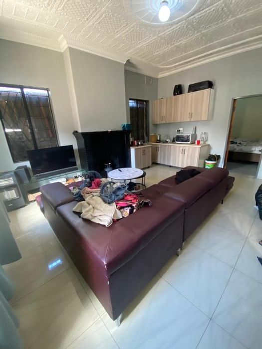 Entertainer's family home near Sandton, with skyline views and a covered balcony with built-in braai; modern kitchen with scullery, three bedrooms, two bathrooms and secure garage.