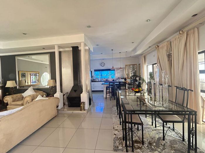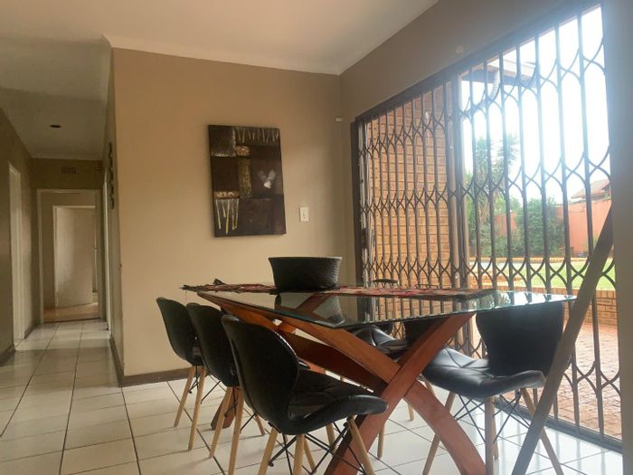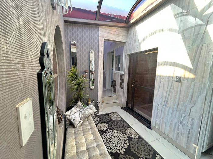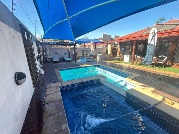 Garden oasis in Eldorado Estate — fragrant flower and herb gardens, atrium with water feature and sunroom, heated pool, jacuzzi and braai patio; solar, secure, 3 beds, 3 baths, double garage.