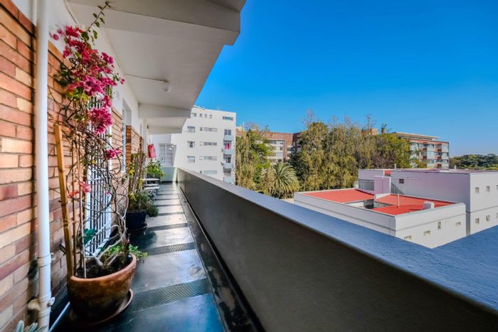 Effortless city living near Killarney Mall and Wits, in an Art Deco corner unit with enclosed balcony/study and backup power; two bedrooms, two bathrooms, garage.