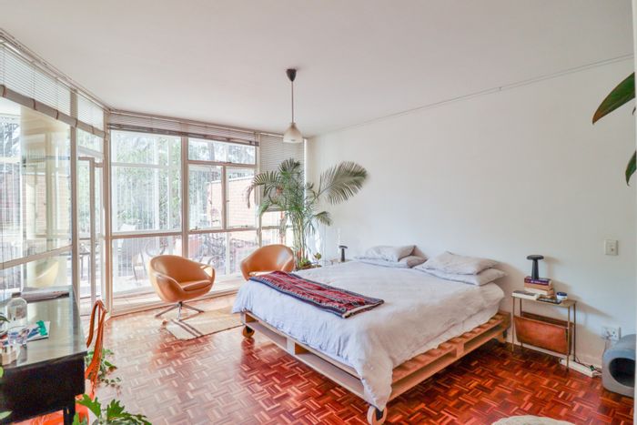 City lifestyle with sundowner balcony in upmarket Riviera, Johannesburg — steps to Rosebank and Killarney Mall. One-bedroom ensuite with secure underground parking.