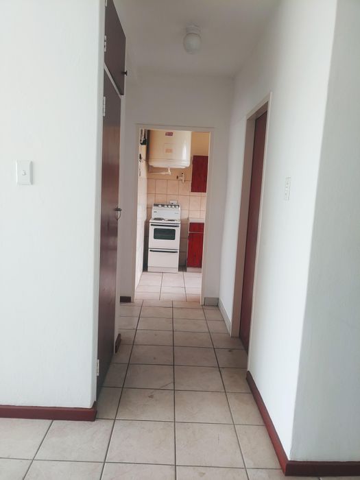 Enjoy commuter-friendly living steps from Rhodesfield Gautrain, Festival Mall and OR Tambo Airport; well-kept complex with communal pool, braai, playground — two-bedroom, one-bath, two covered parking.