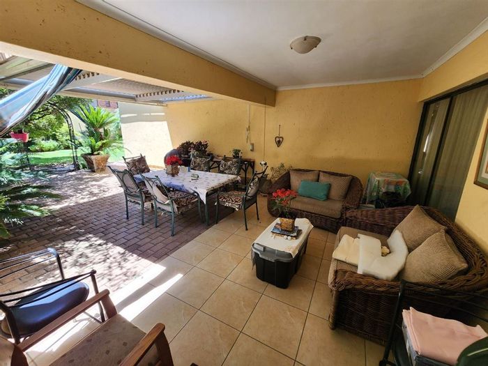 Effortless indoor–outdoor entertaining in Van Riebeeck Park, Kempton Park, with covered patio, elevated braai deck and pool; solar-powered, lush irrigated garden and three beds, two baths.