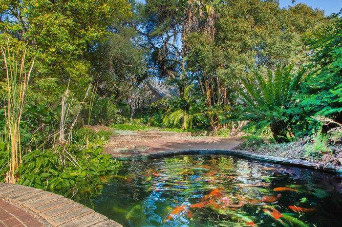 Relax in leafy, private grounds with sweeping sunset views and a private viewing deck, manicured garden and pool — four bedrooms, four bathrooms, four-car garage.