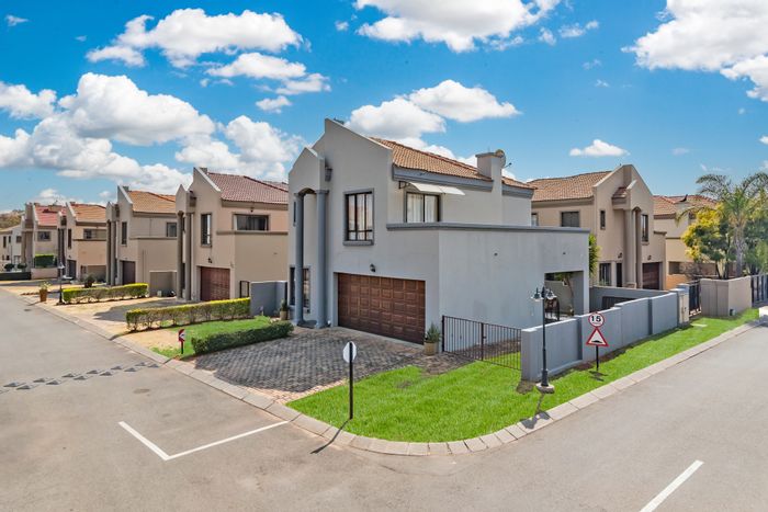 Entertainer's townhouse in prestigious Theoschea Estate with Caesarstone kitchen flowing to courtyard patio and built-in braai. Main suite with walk-on balcony; 3 beds, 2.5 baths, four covered parking.