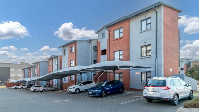 Live centrally in Grand Central, Midrand — walking distance to shops, restaurants and highways; smart one-bedroom, one-bath apartment with covered parking and handy outside laundry.