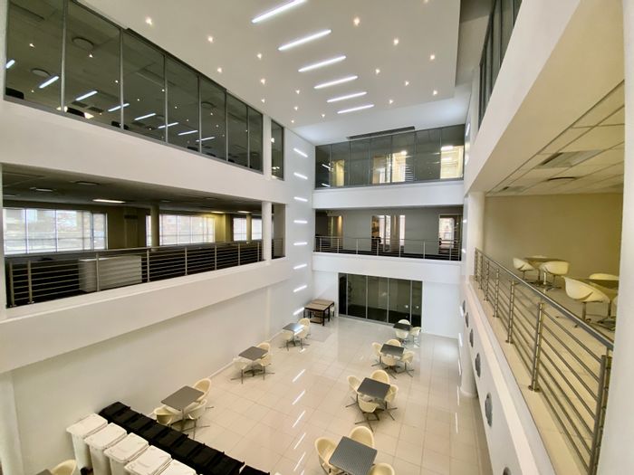 Commanding visibility opposite Midrand Gautrain Station, this multi-level office with a light-filled central atrium offers large open-plan floors, full backup generators and easy N1, Sandton, Pretoria access.
