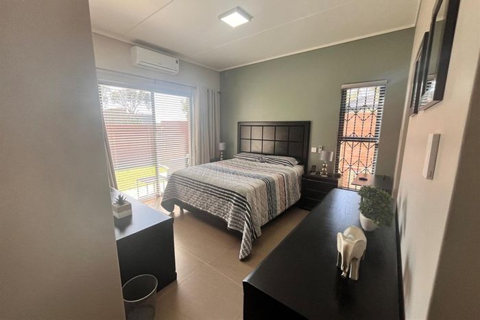 Enjoy relaxed entertaining on a private patio with built in braai in The Woods, Kyalami — upgraded finishes, island kitchen, full backup power, two beds, two baths, double covered parking.
