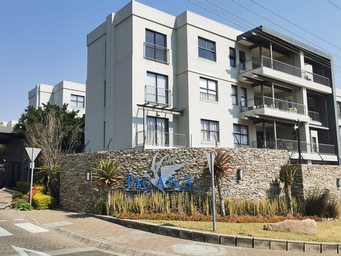 Enjoy secure estate living in Jacana Estate, Kyalami — first-floor apartment with high-end kitchen, covered balcony and scullery, communal pool, gym and restaurant; two beds, two baths, two covered parking.