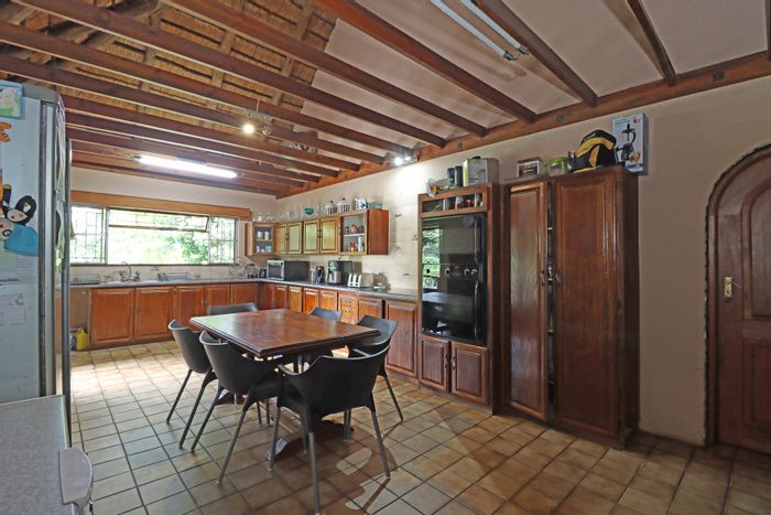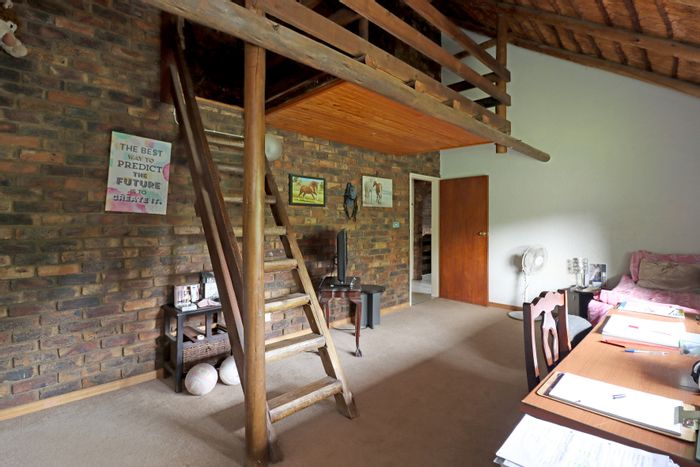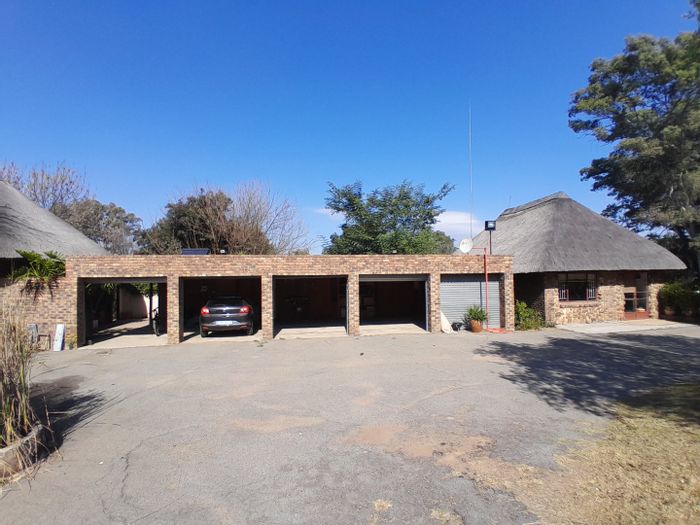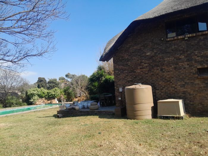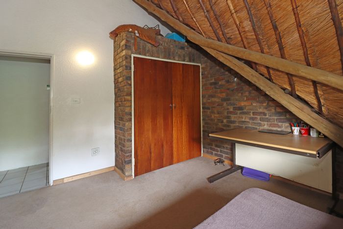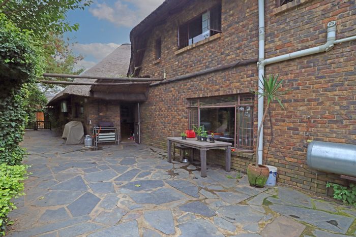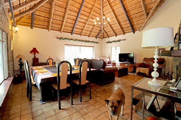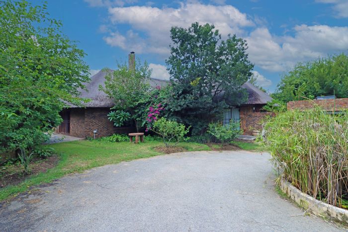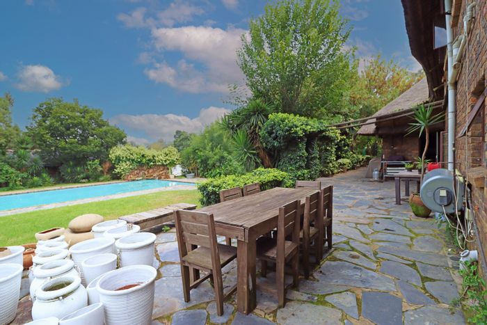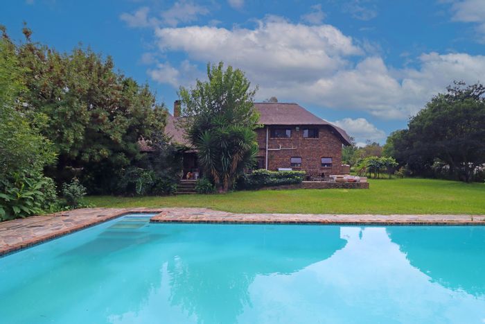 Country living in secure Randjesfontein Estate—rustic thatched family homestead on 1.1ha with bridle-trail access, five stables, pool, double-volume entertaining area and income cottages.