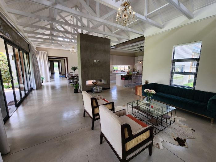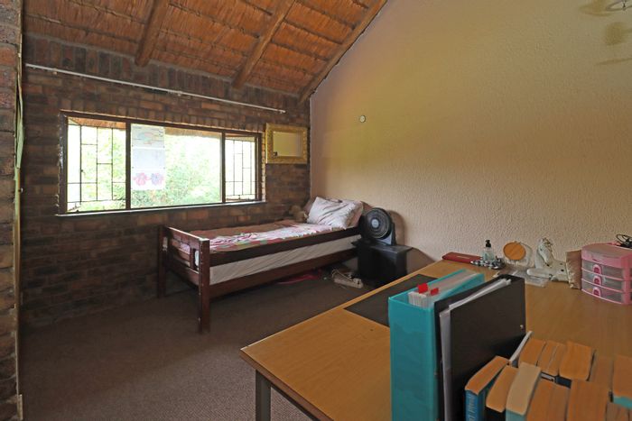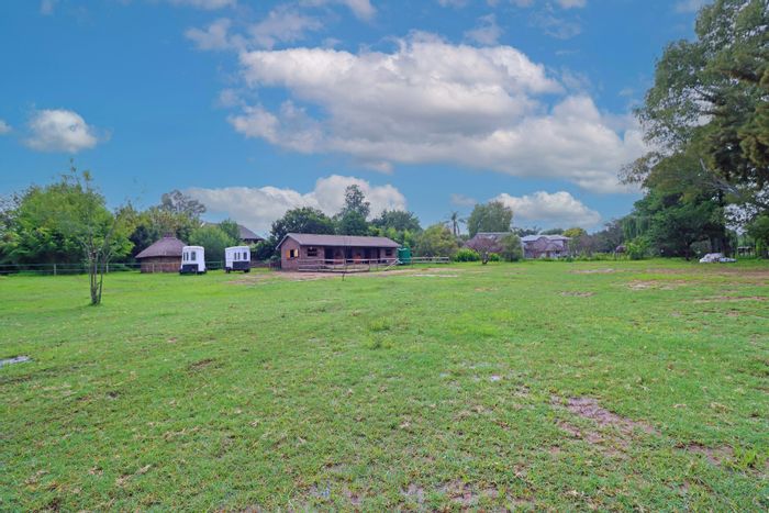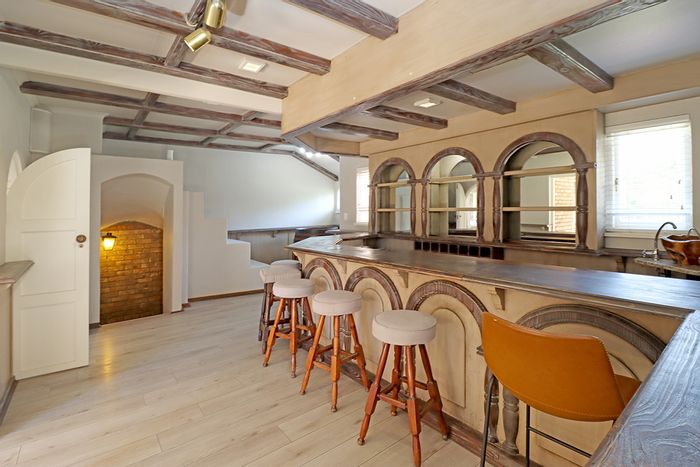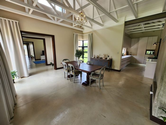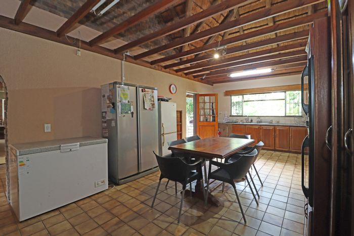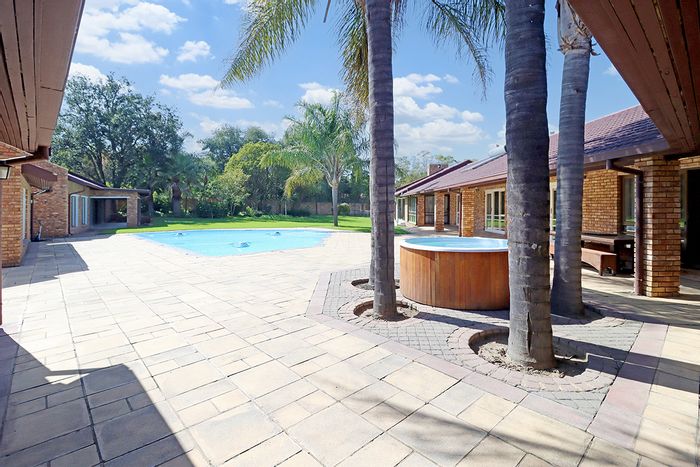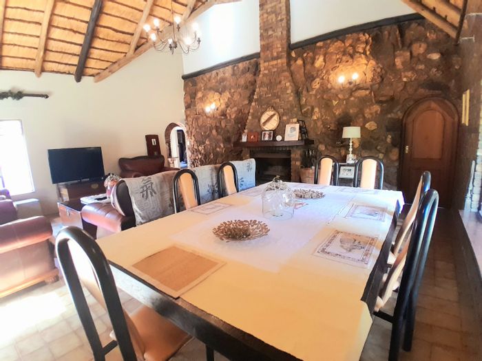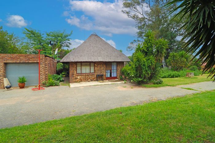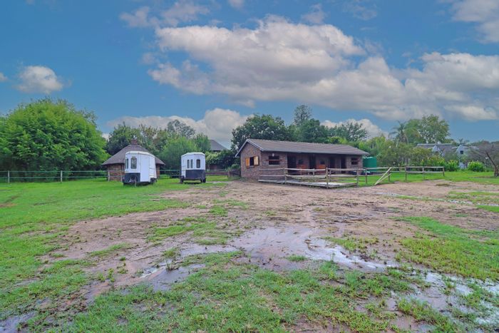 Country living in secure Randjesfontein Estate—rustic thatched family homestead on 1.1ha with bridle-trail access, five stables, pool, double-volume entertaining area and income cottages.