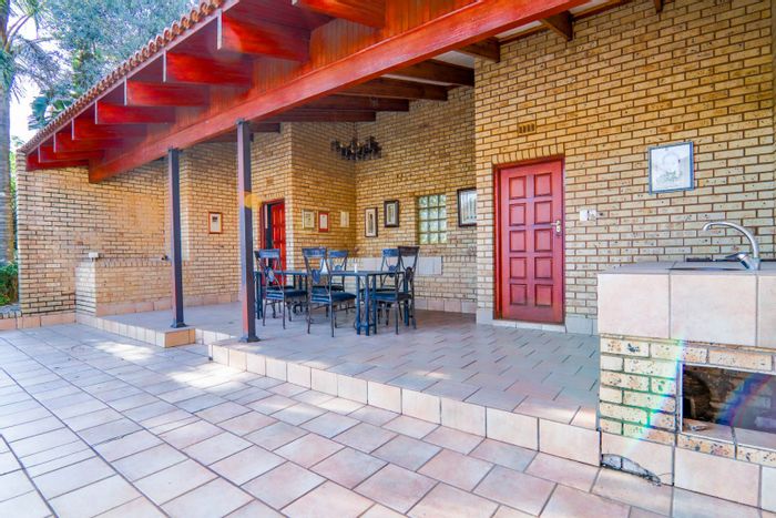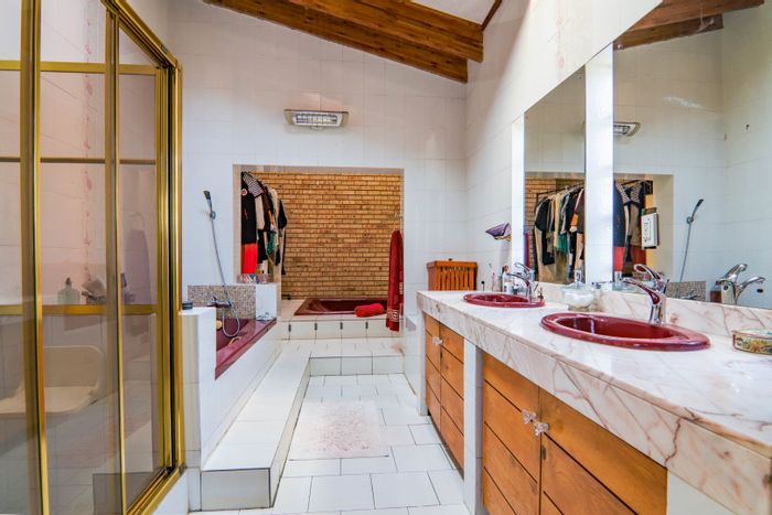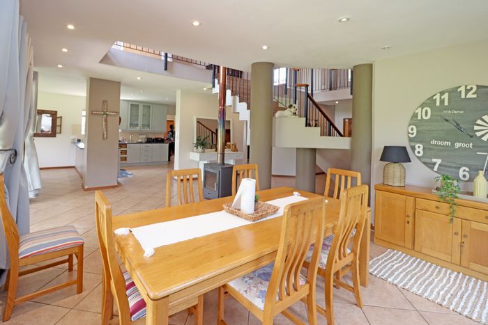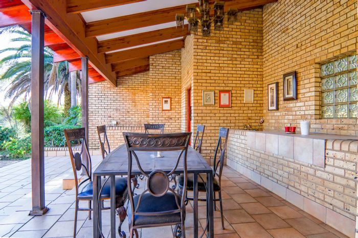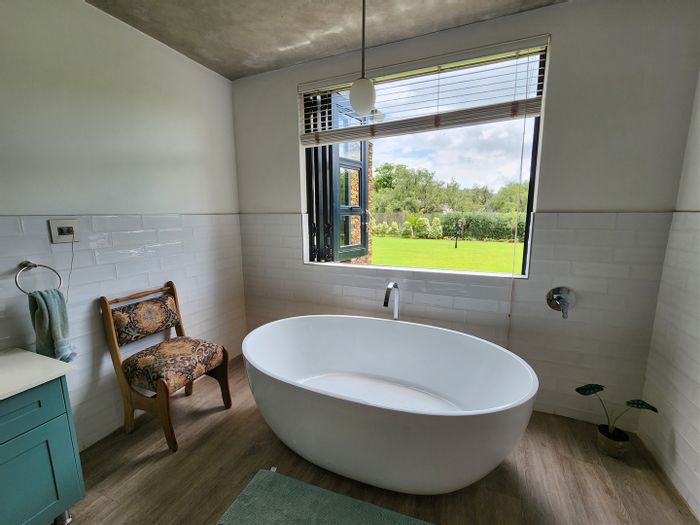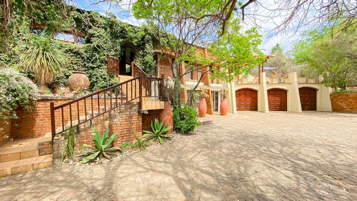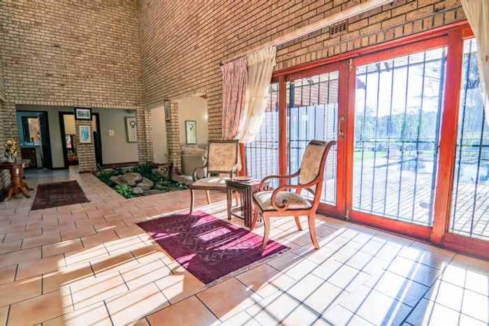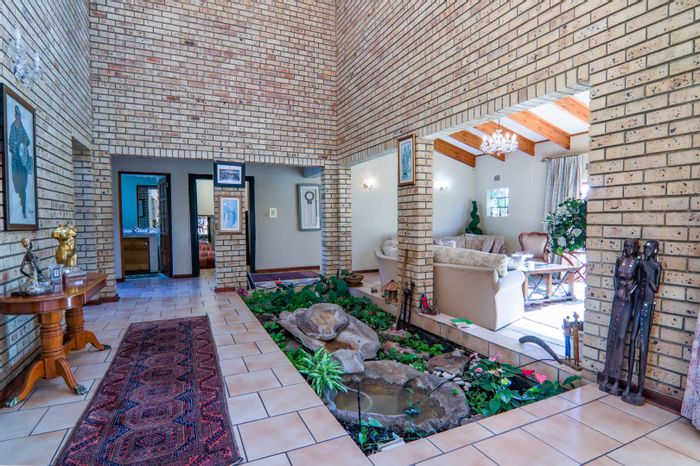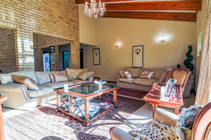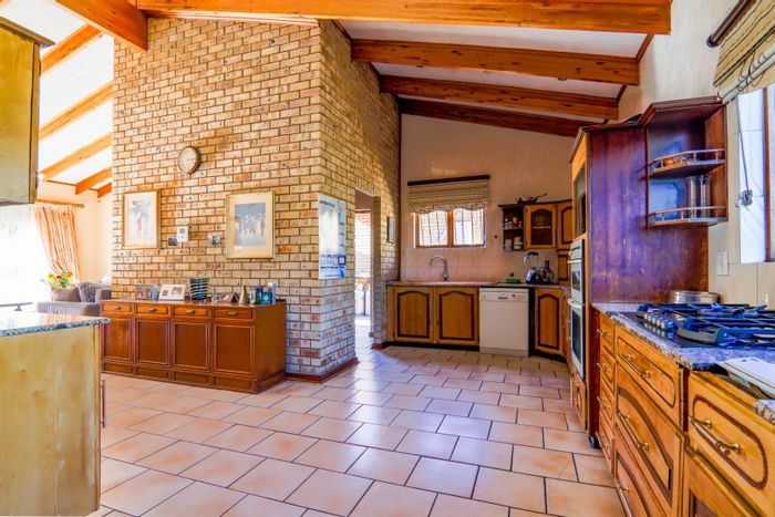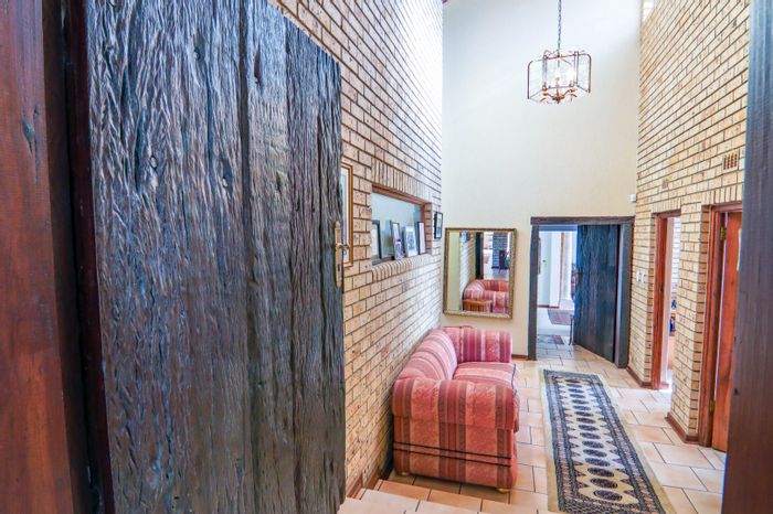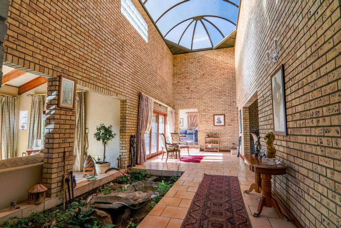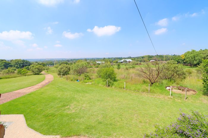 Hilltop Randjes retreat with immaculate manicured gardens, double-volume living and exposed rafters, under-roof braai patio, and a magazine-worthy ensuite with freestanding bath — land ideal for stables or pool.