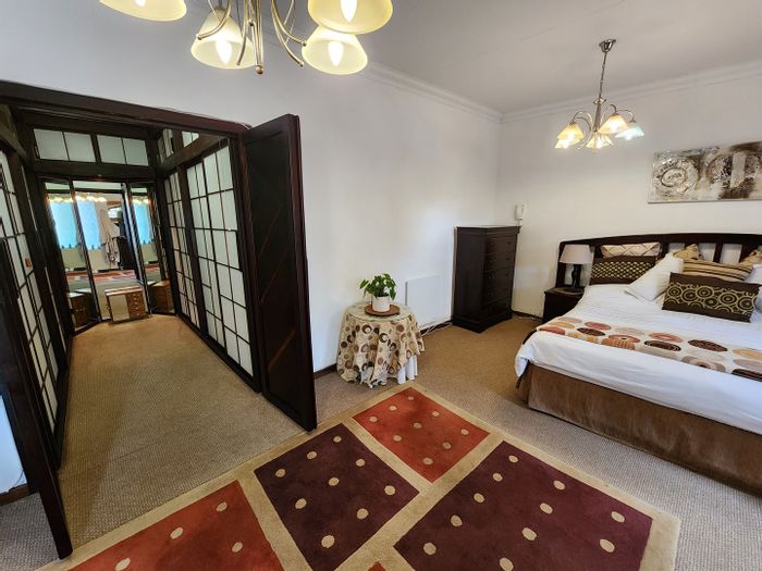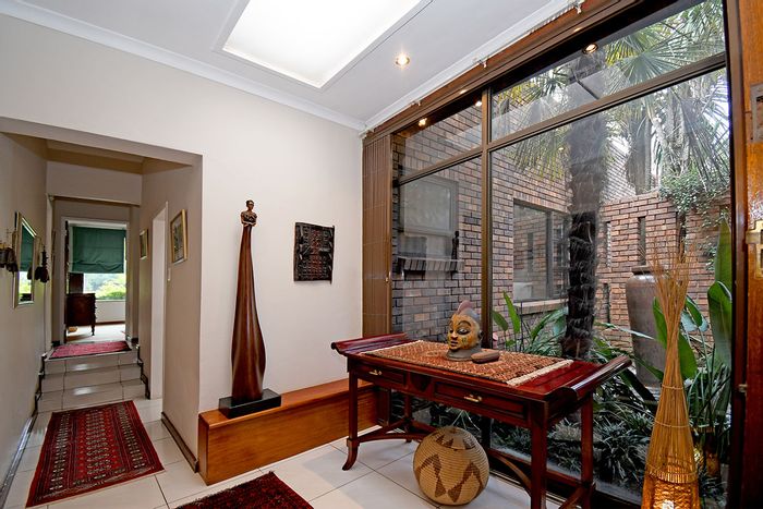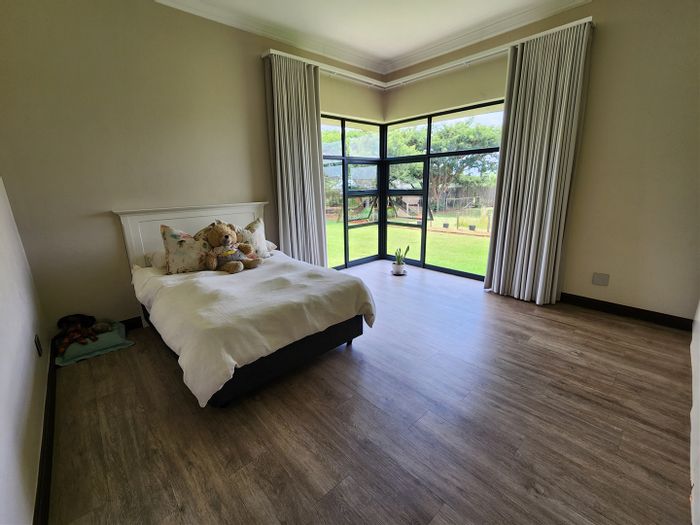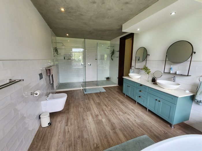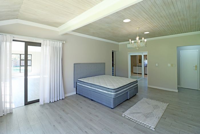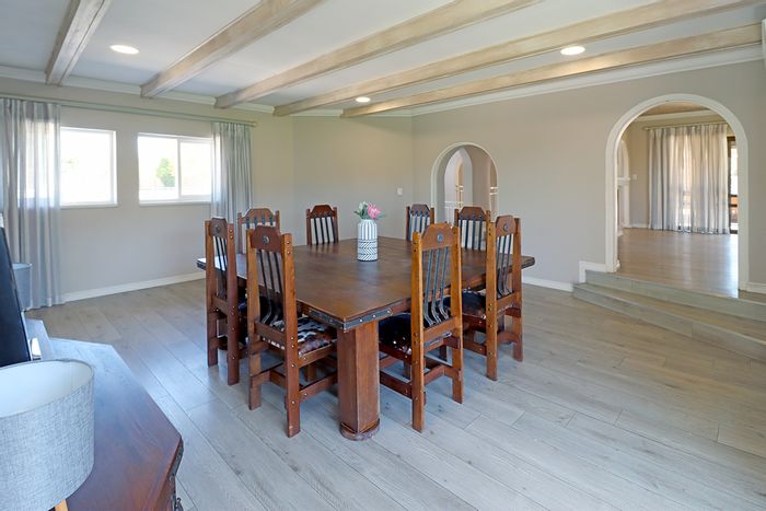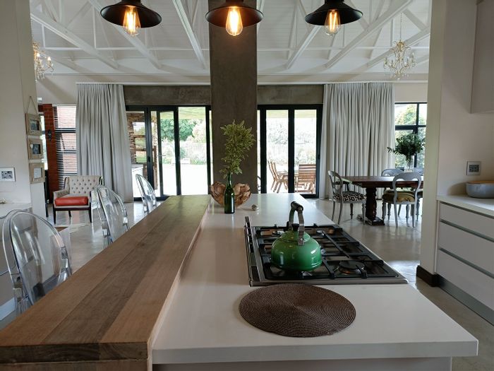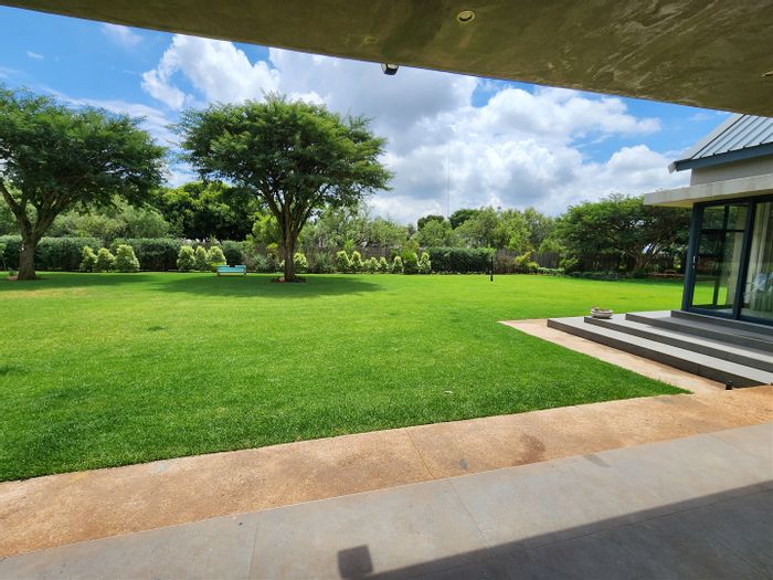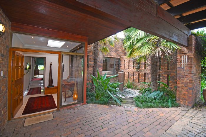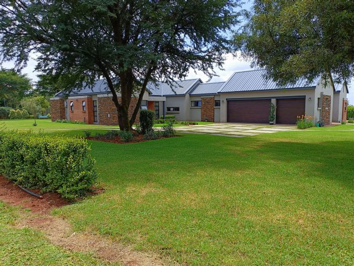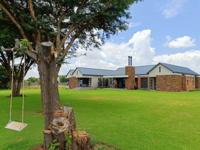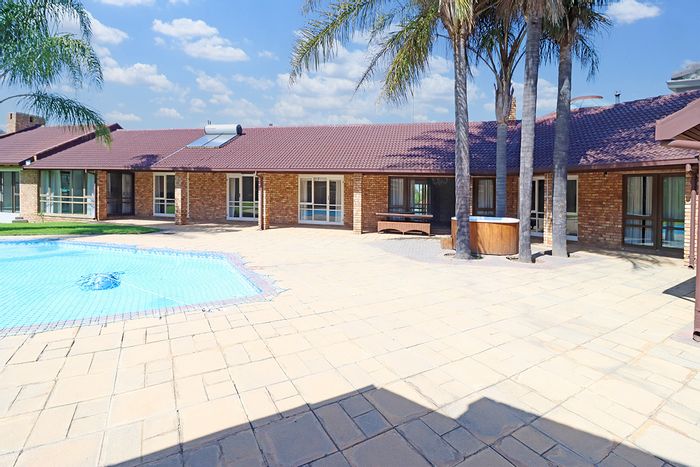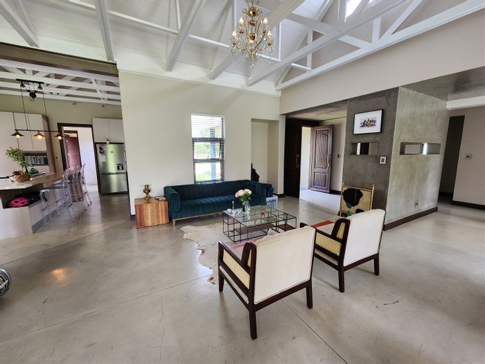 Hilltop Randjes retreat with immaculate manicured gardens, double-volume living and exposed rafters, under-roof braai patio, and a magazine-worthy ensuite with freestanding bath — land ideal for stables or pool.